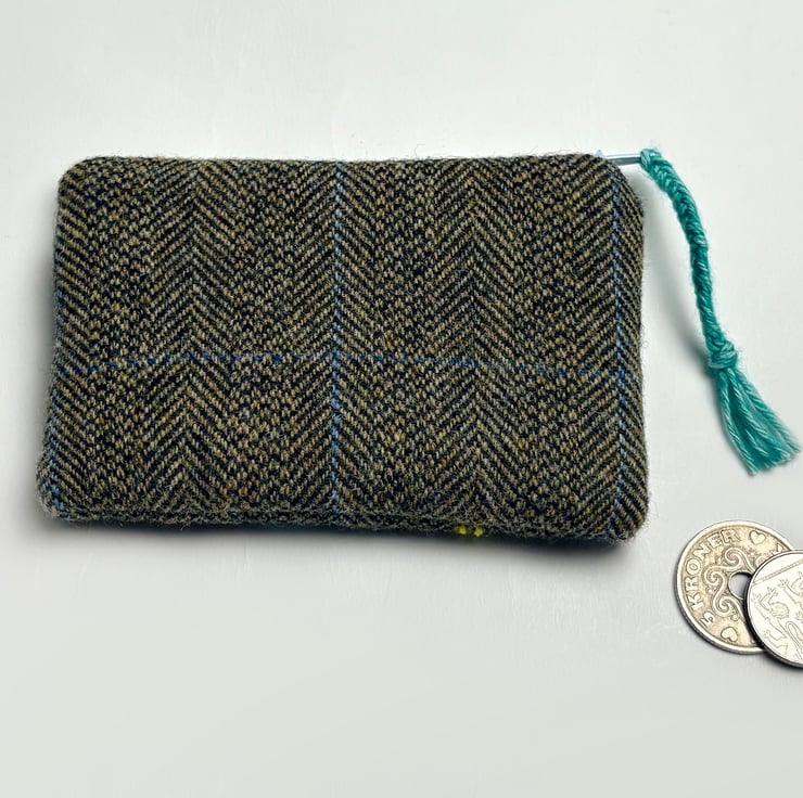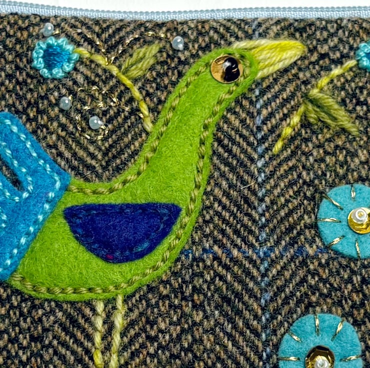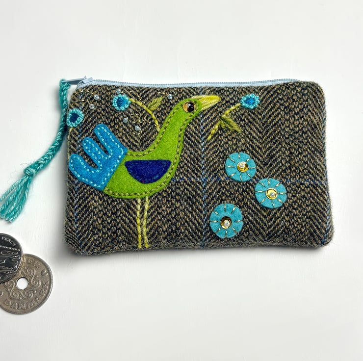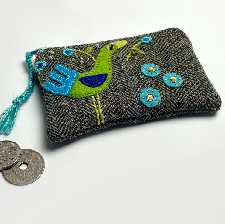 This little card and key purse (3" by 5"/7.5cm by 12.5cm) has been made in green/buff herringbone wool check fabric and has been hand embroidered with a peacock and flower design and enhanced with beading. The purse is wadded and fully lined with a cotton print fabric and has a pale blue coloured zip and a turquoise blue plaited zip pull.