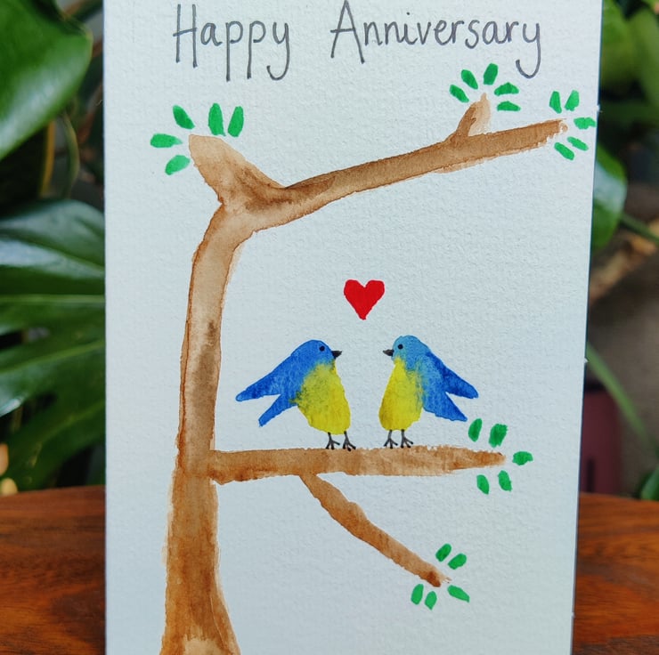 Celebrate love with this heartwarming handmade anniversary card, featuring two watercolour lovebirds perched on a tree branch with a red heart between them. The gentle illustration and minimalist charm make this card a thoughtful, romantic choice for anniversaries of all kinds.
