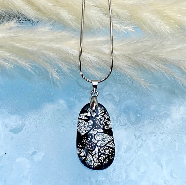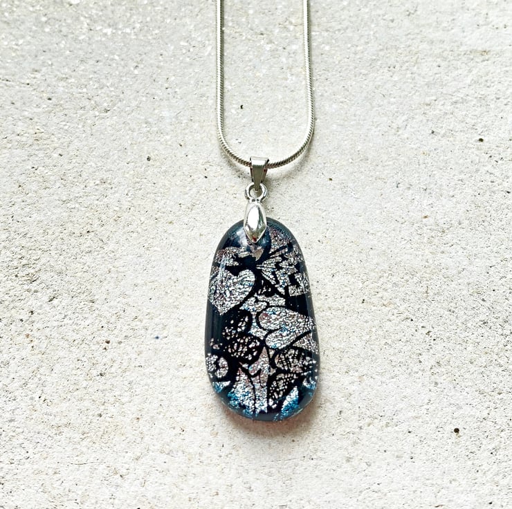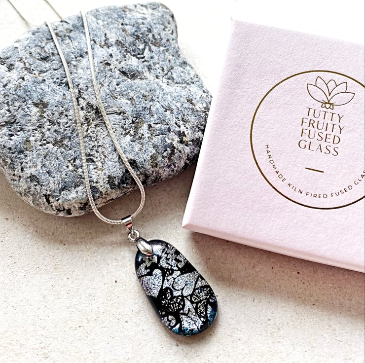 A romantic fusion of shimmer and sparkle, this handmade fused glass pendant features delicate silver hearts dancing across a jet-black background. Crafted with shimmering glass, each heart catches the light beautifully, giving a magical glimmer from every angle.