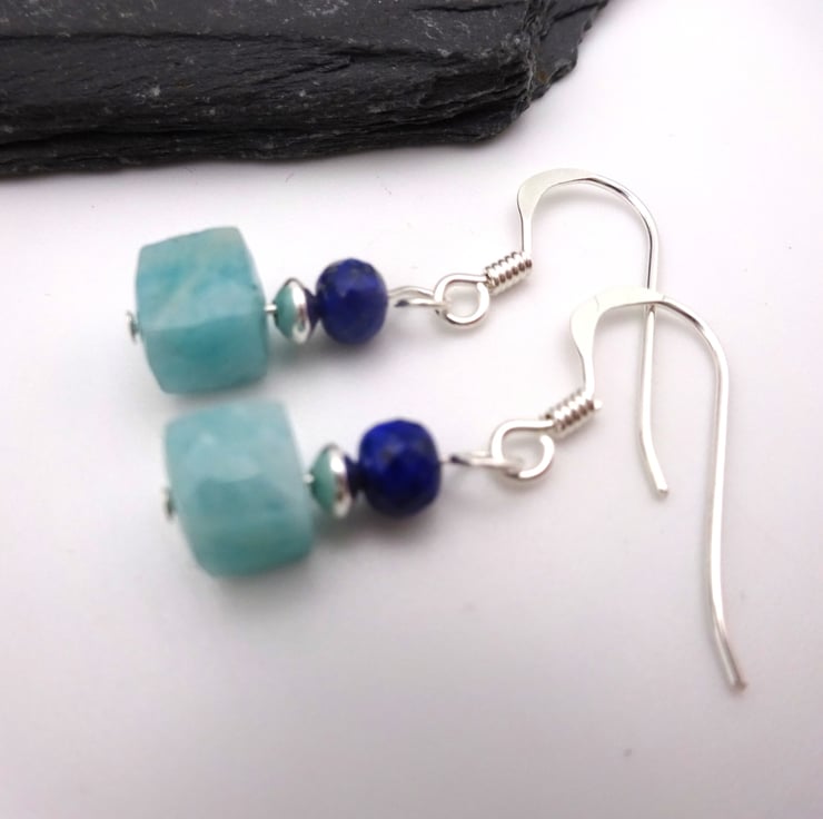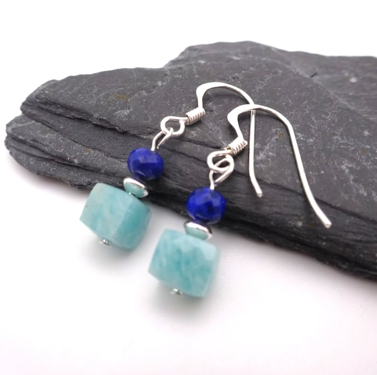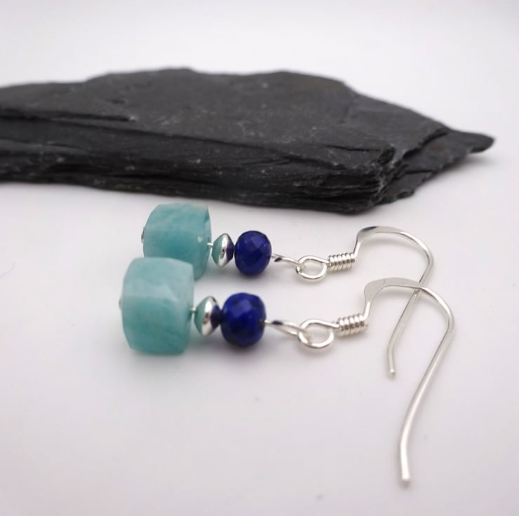 A pair of sterling silver earrings featuring Amazonite and Lapis Lazuli gemstone beads with sterling silver disc beads.
