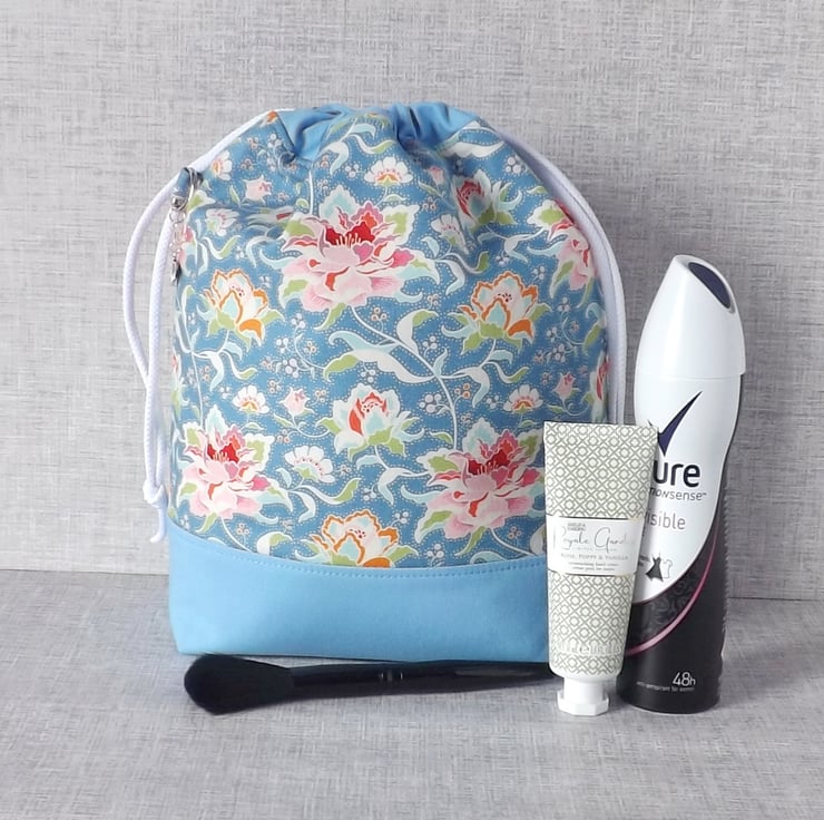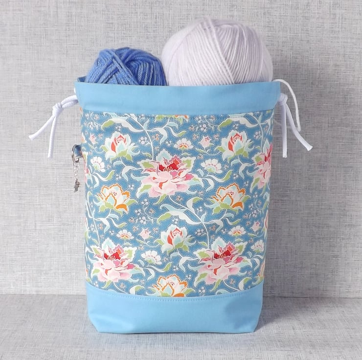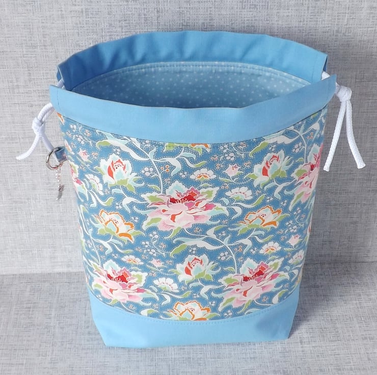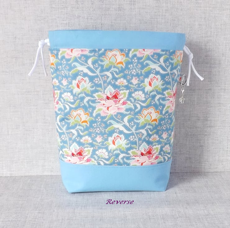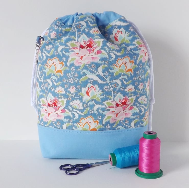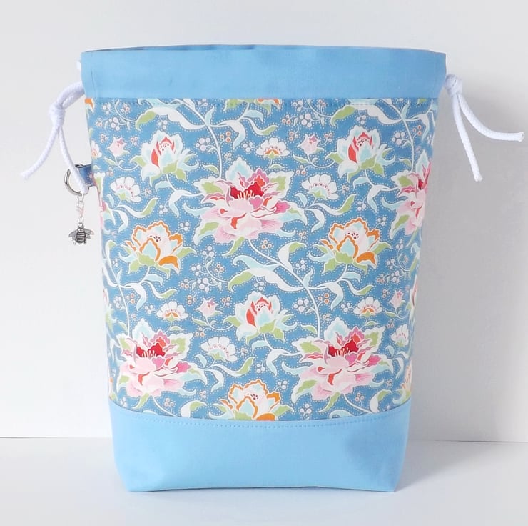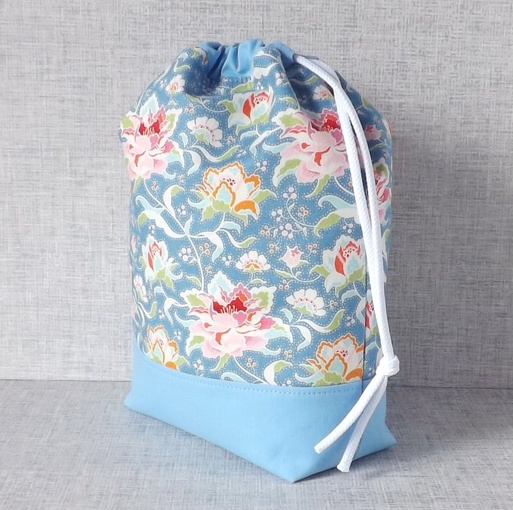 A project bag, drawstring bag, made from a lovely cotton fabric by Tilda with a floral design in pink, orange & white on a blue background, combined with a plain sky blue fabric. The lining is a light blue cotton fabric with white stars.