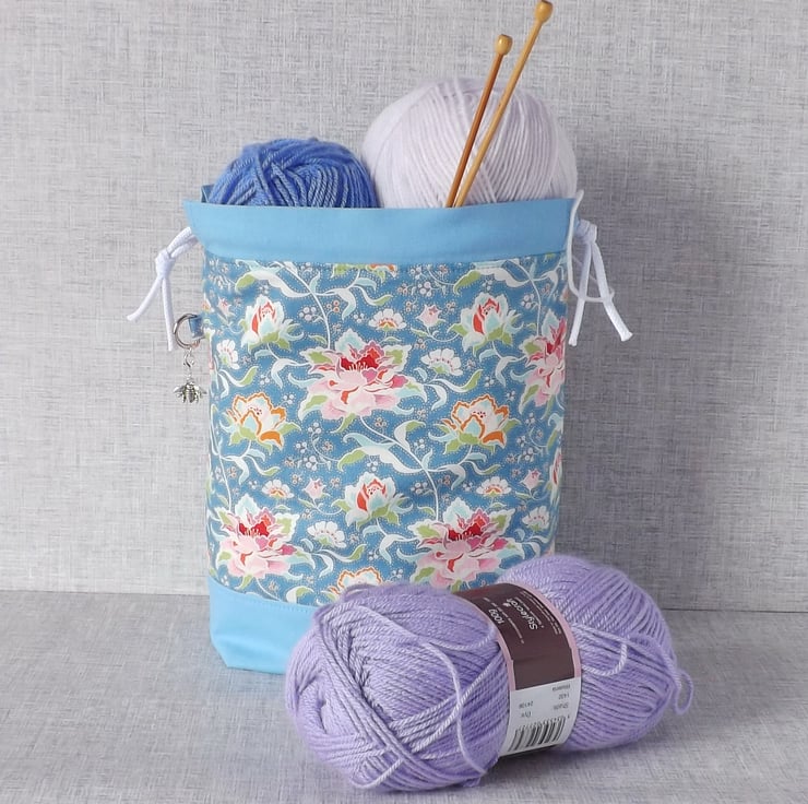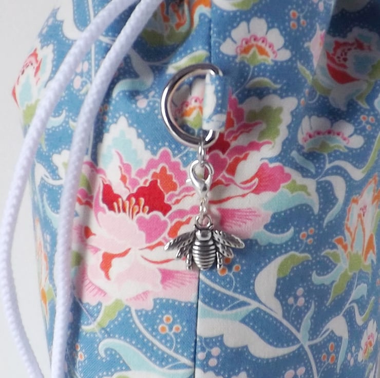 I have included a bee charm/stitch holder which is attached to a D ring on one side of the bag, and the bag closes with white drawstrings.
