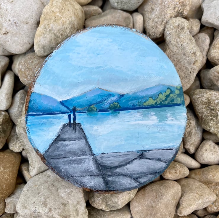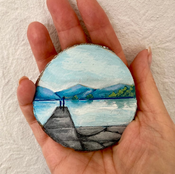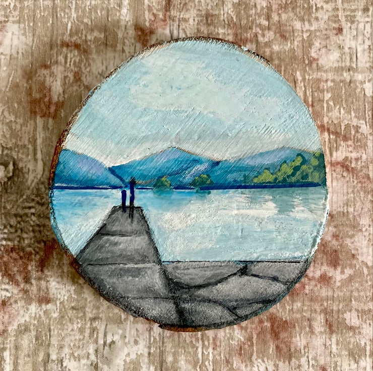 This is a tiny painting of Lake Windermere on a 6cm diameter wood slice.