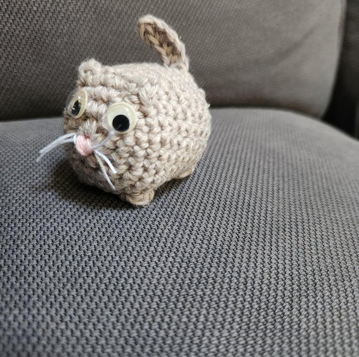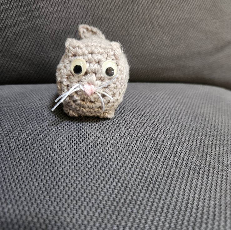 A cute little cat crocheted from grey cotton with googly eyes and white whiskers. He measures approximately 6cm long.