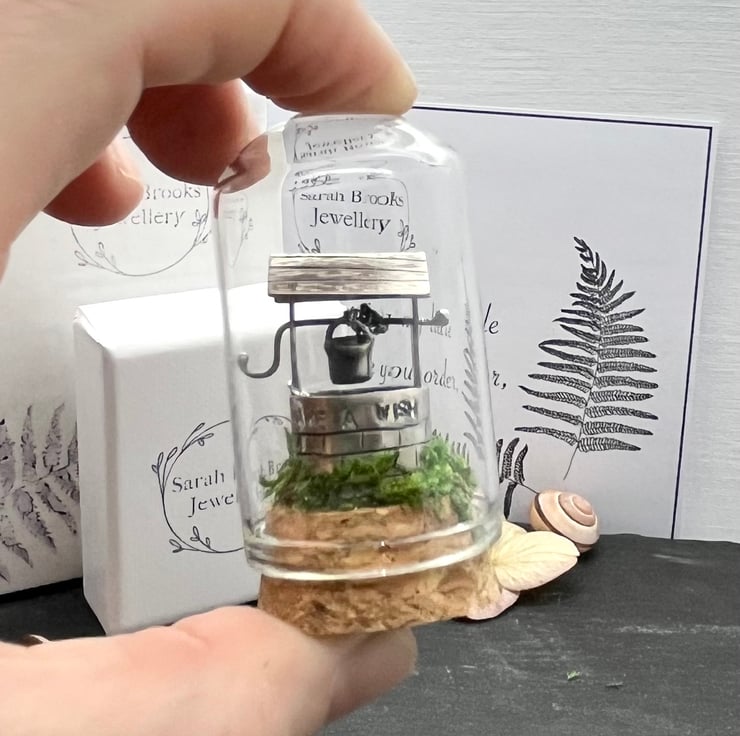 Surrounded by moss in a tiny bell jar which measures 2.8cm x 5.8 cm.