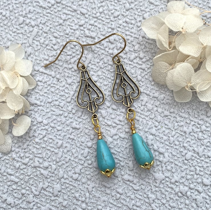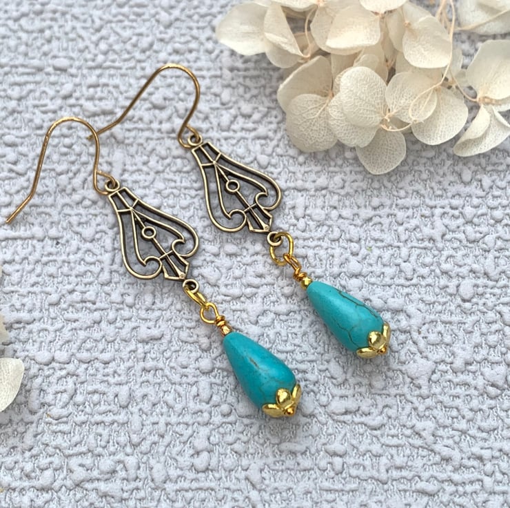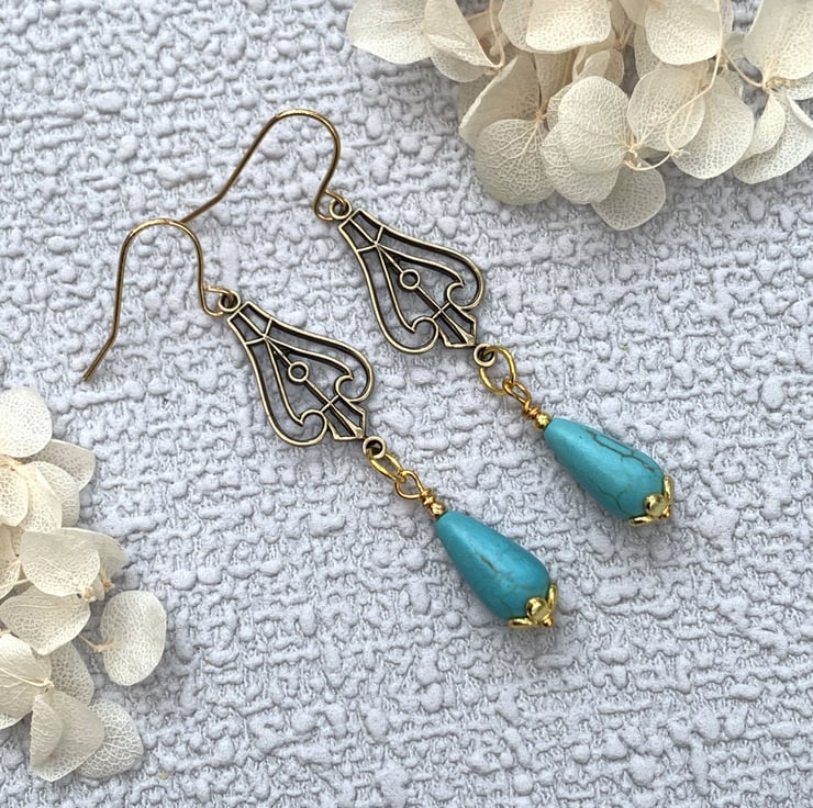 These pretty Art Nouveau style earrings are made with antique gold-plated vintage style connectors with turquoise teardrop beads. The earrings are finished with gold-plated ear hooks and they are 5.5cm in total length.