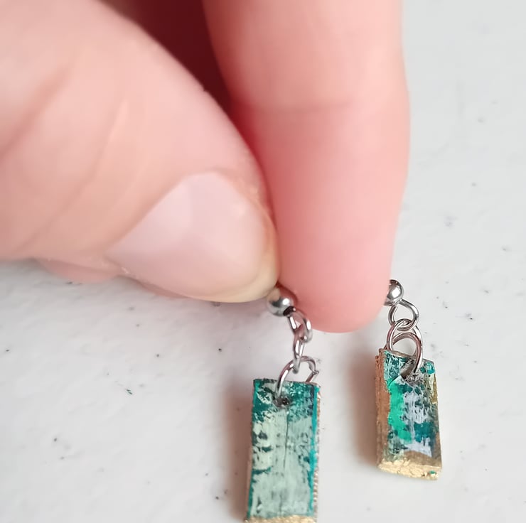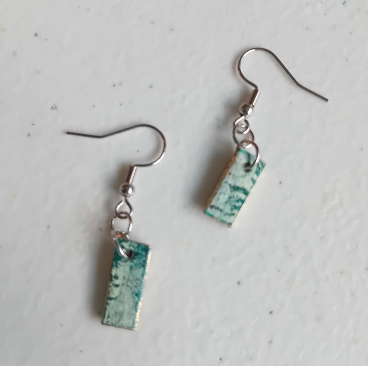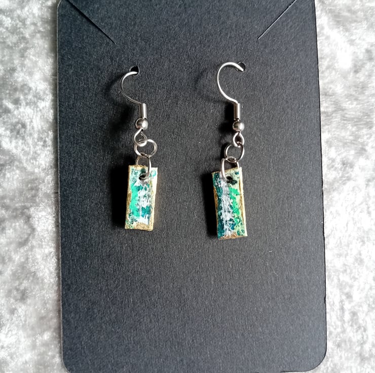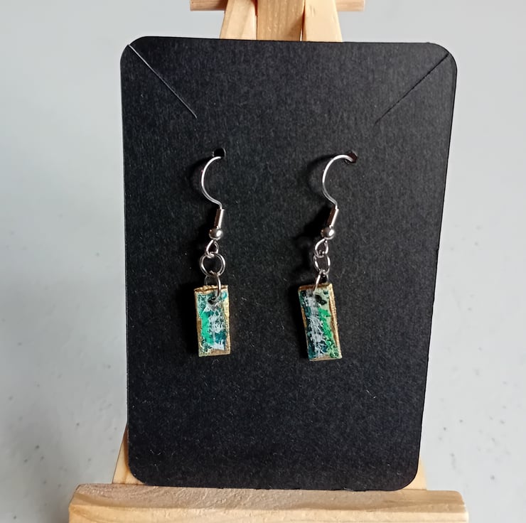 This is a pair of gorgeous, unique upcycled canvas earrings in a green colourway with gold finish to the edges. I am an artist and trim some paintings to mount, so this means those trims aren't wasted!