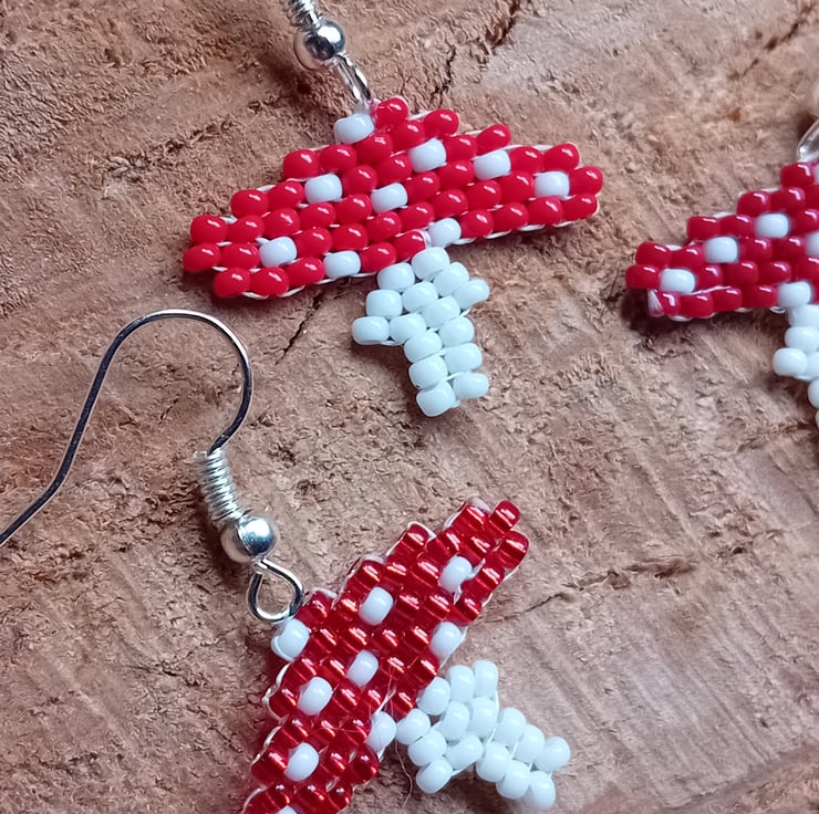 Each pair is made using the brick stitch beading technique, with tiny red and white seed beads and finished with silver-plated ear wires.