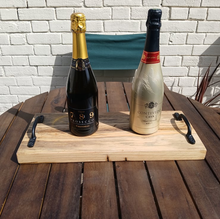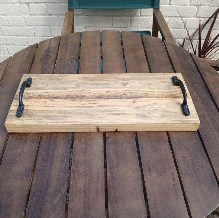 This handmade reclaimed wood serving tray is a charming addition to any dining table or kitchen. Crafted from wood with dimensions of 490mm in length, 38mm in depth, and 200mm in width, this tray is both functional and stylish. Perfect for serving drinks or as a table centre piece, this unique piece is sure to add character to your home decor. Enjoy the natural beauty of reclaimed wood in the convenience of a serving tray. This has been finished with a medium oak wax and has black steel handles to carry the tray.