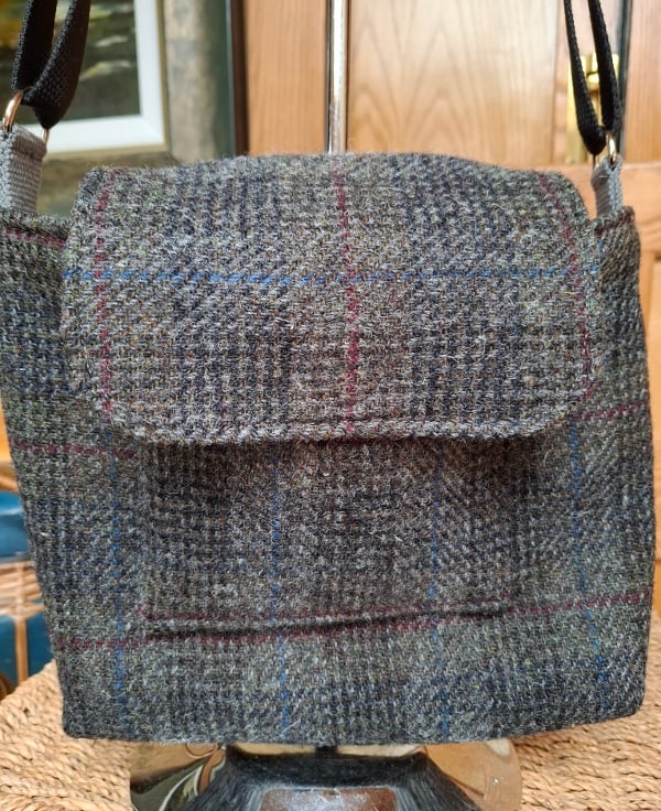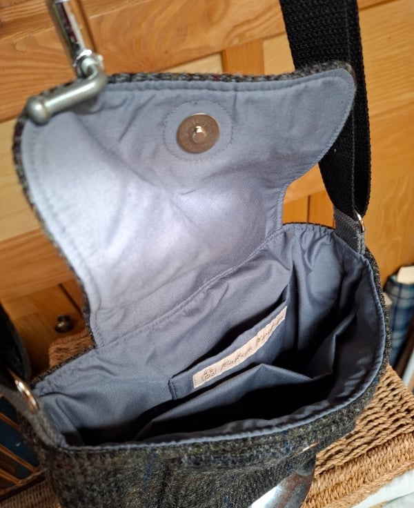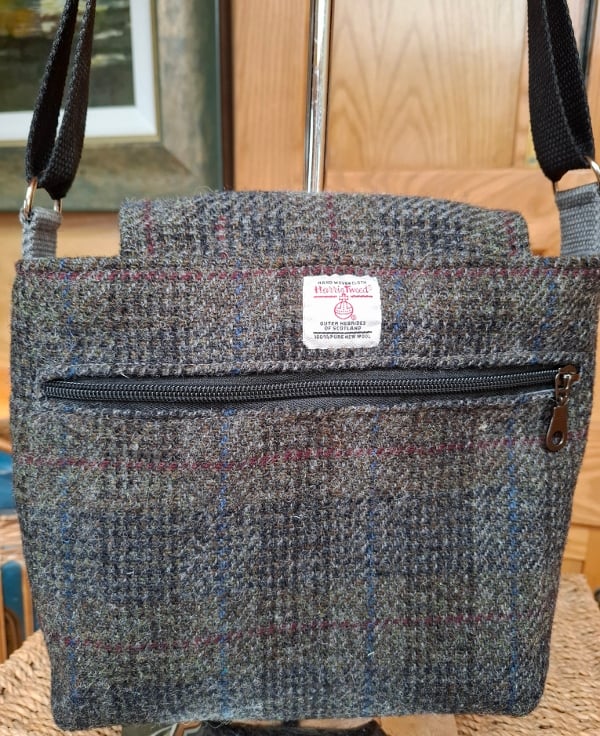 Harris tweed crossbody messenger bag, in dark shades of grey, blue and red, with zipped pocket on the back and a patch pocket under the front flap. Lined in grey cotton, with inside pockets, magnetic fastener and adjustable cotton webbing strap.