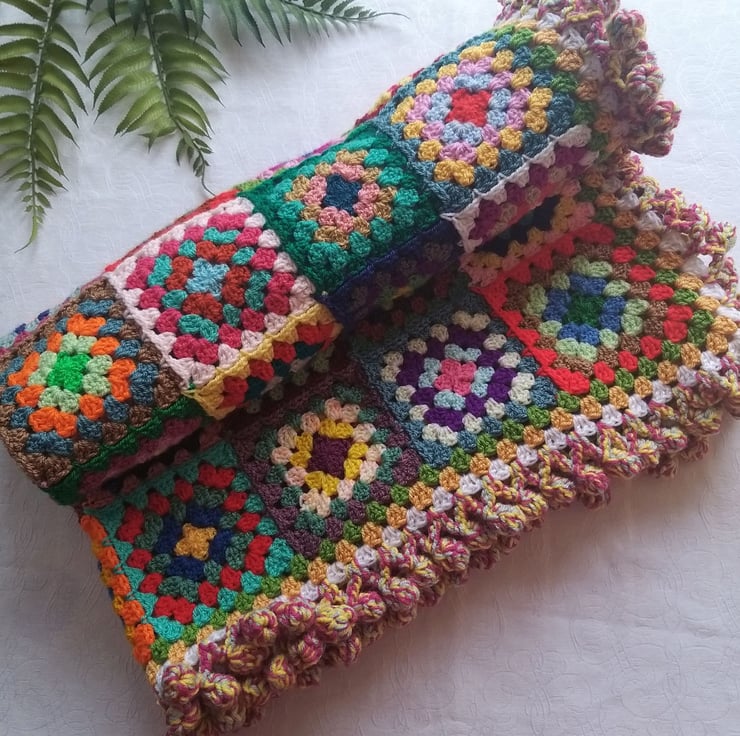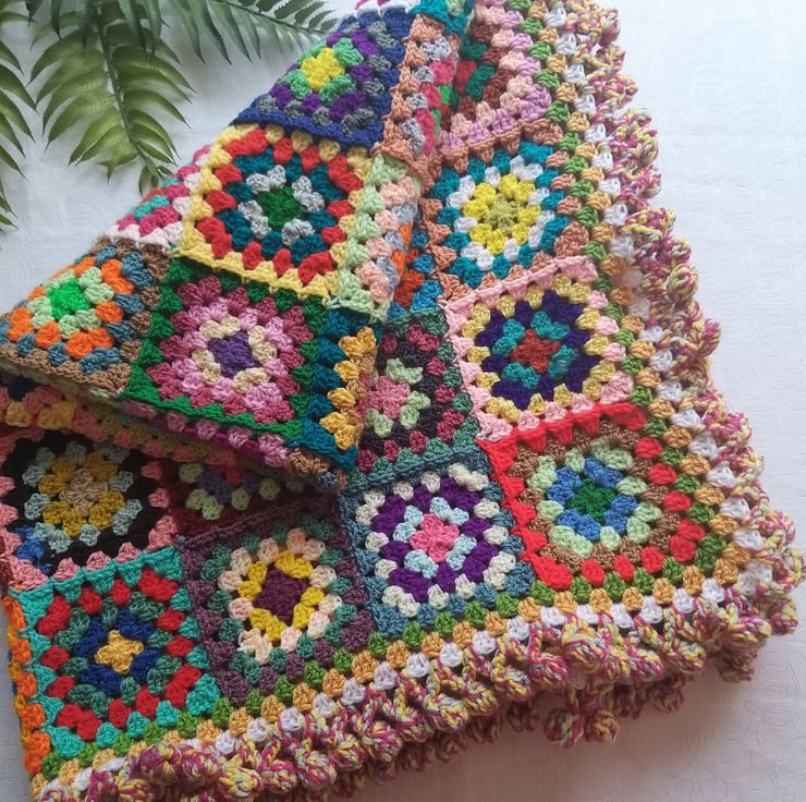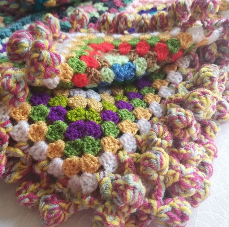The one thing my ‘Happy Scrappy’ blankets have in common is the giant bobble border. I use 3 strands of yarn at a time and a jumbo sized hook to make and I don’t think you’ll find many blankets with a border quite like this!