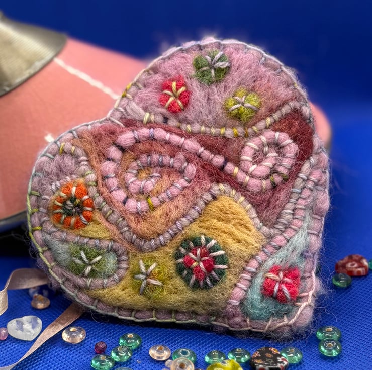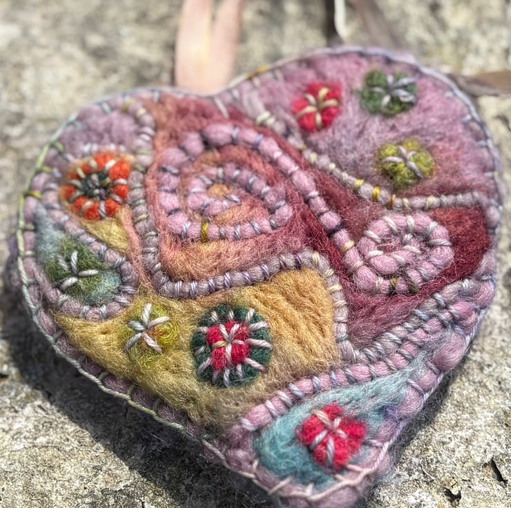 The hanging ornament is created from a needle felt and embroidered motif with an added metal hanging loop and silk ribbon.