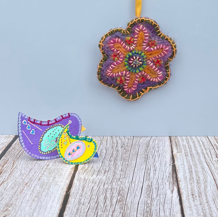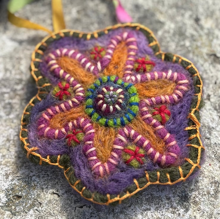 The hanging ornament is created from a needle felt and embroidered motif with an added metal hanging loop and silk ribbon.