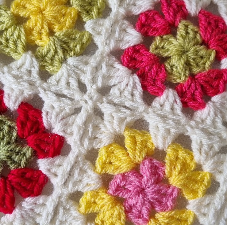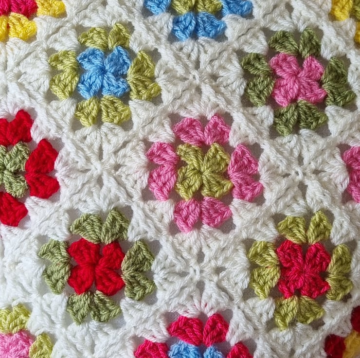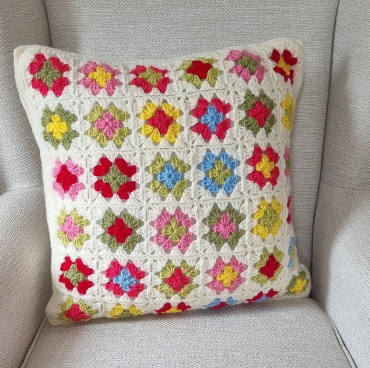 Handmade crochet cushion cover, multi coloured squares joined with cream border. A slight variation on reverse. Closure is stitched fasteners. I use acrylic yarn so the cover is washable, I recommend by hand or on a gentle washing machine cycle - pop the cover into a laundry bag/pillow case and dry flat.