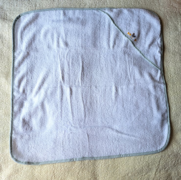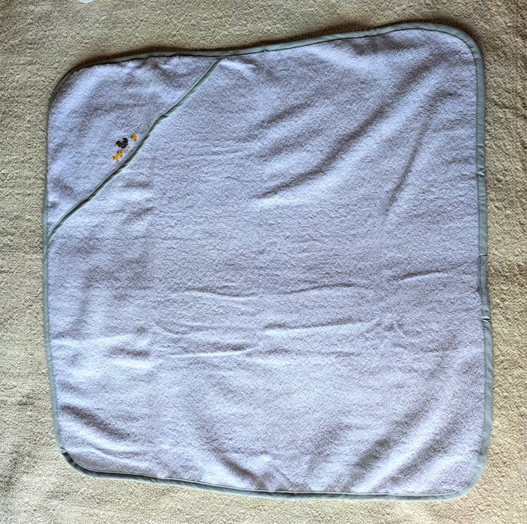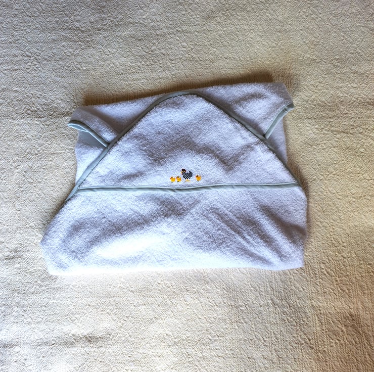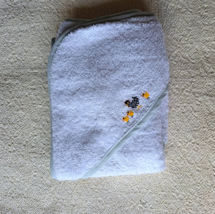I have hand embroidered a speckled black and white hen and her three yellow chicks on this lovely soft hooded baby towel from Tesco. The towel is white with a pale green bias binding around the edges. It measures 70cm. square approximately, is all cotton and can be machine washed.