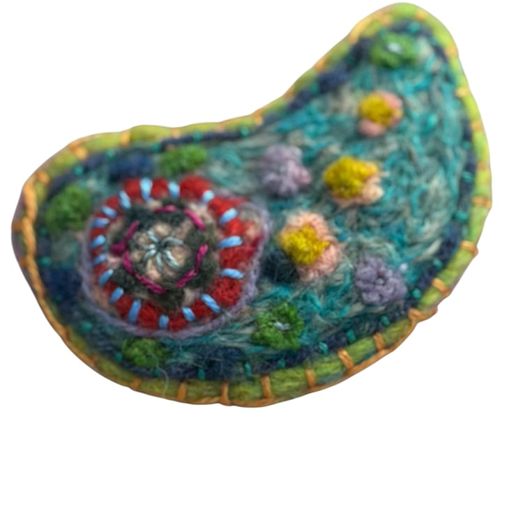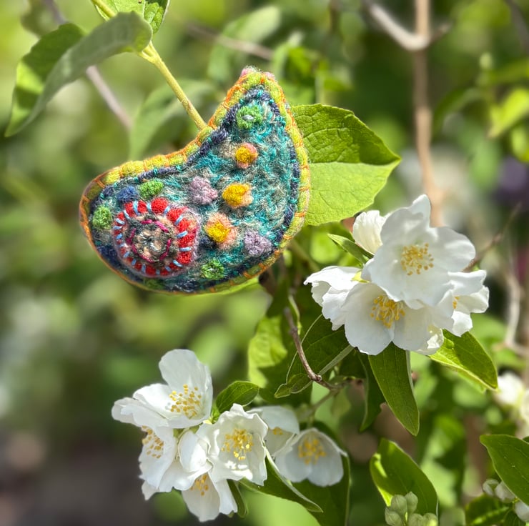 The brooch is created from a needle felt and embroidered motif, backed by wool felt with a pin added.