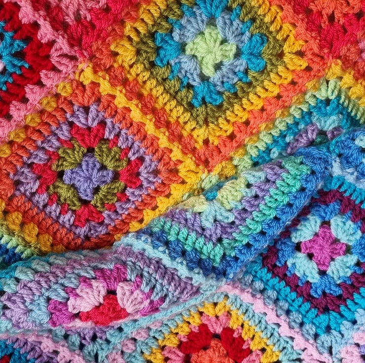 Handmade crochet blanket, multi coloured squares, bright colours in a blend design across the squares. I use acrylic yarn so the blanket is washable, I recommend by hand or on a gentle washing machine cycle - pop the cover into a laundry bag/pillow case and dry flat. Blanket measures 54" x 54".