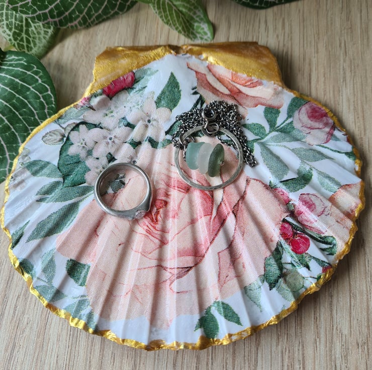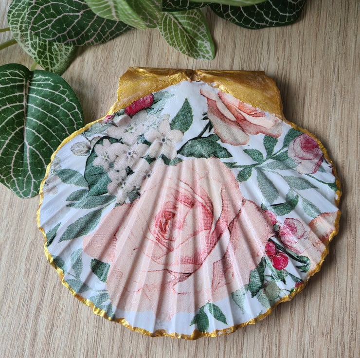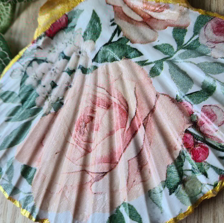 This beautiful scallop shell has been cleaned and I painted it before decoupaging with a pretty pale pink rose design paper napkin.