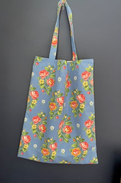 Perfect for Summer, this gorgeous floral shopping bag is made from a remnant of Laura Ashley fabric featuring a garden posy design on a royal blue background; it is lined with a co-ordinating pale blue ticking stripe cotton fabric.
