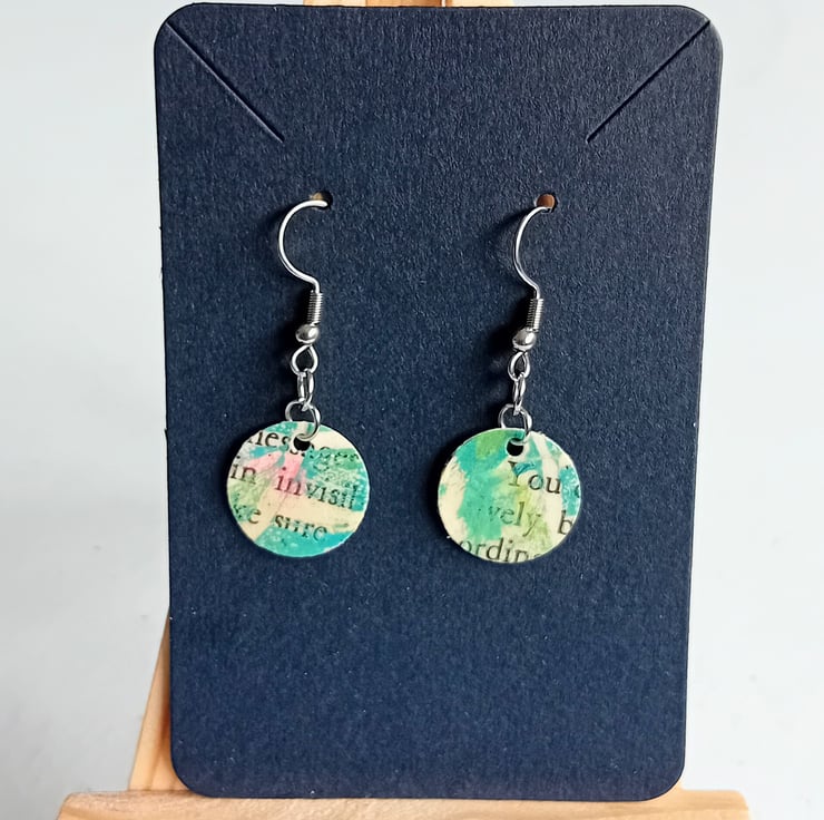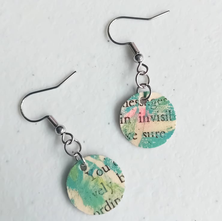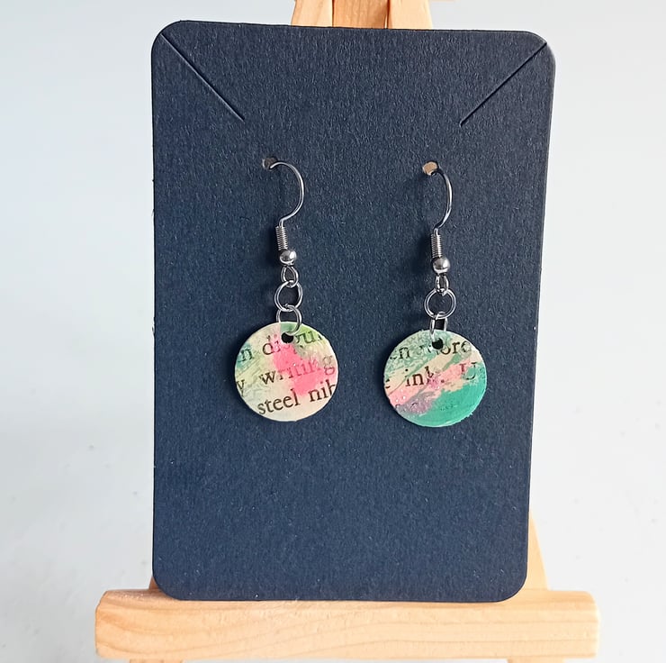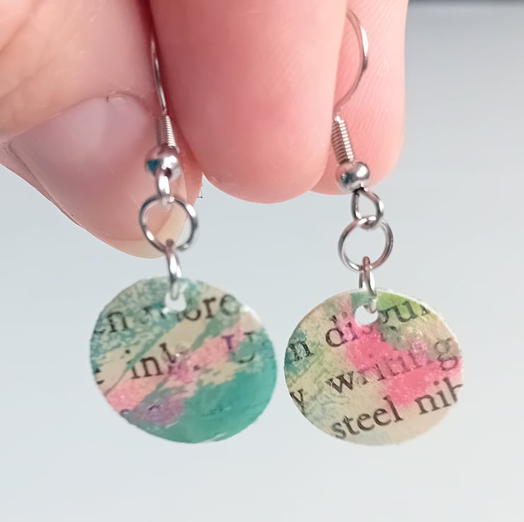 This is a fab pair of unique handmade small round shaped dangle earrings created from painted vintage book pages. This was left over from creating a collage artwork, but was too pretty to waste! I have added a little sparkle detail and finished with a gloss coating.