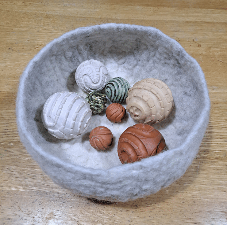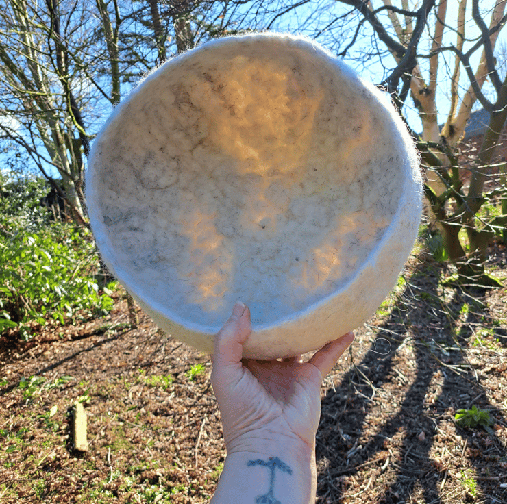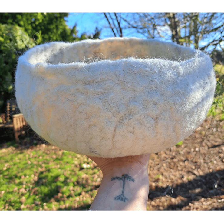 Material: 100% natural, undyed British wool – creamy white with hints of grey. Made using traditional wet-felting techniques with just rainwater, gentle olive soap, and care – no harsh chemicals, ever.