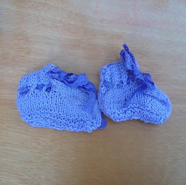 this is a handknitted set comrpising of a helmet style hat in lilac acrylic wool together with matching booties. The hat measures approximately 11 inches around the widest part and it is fastened with one button. The booties are fastened with lilac lace. The sole of the booties is approximately 4 inches. To fit approximately 0-6 months size but please check measures. Ideal baby shower or new baby gift