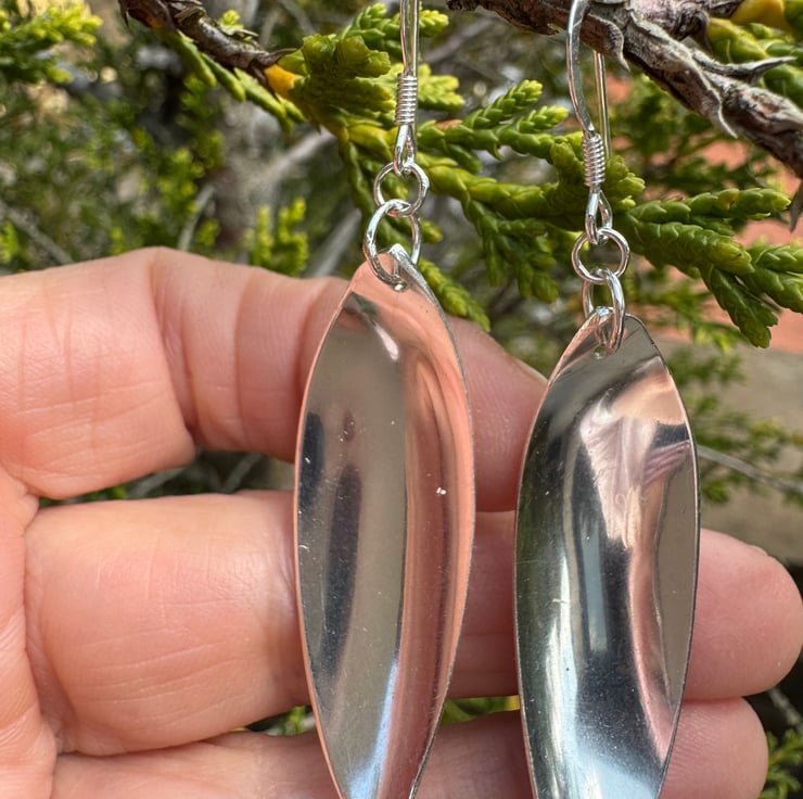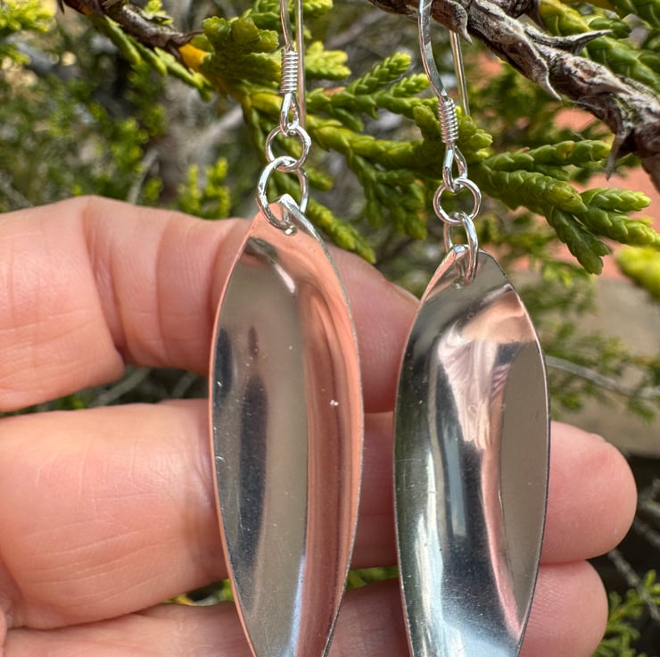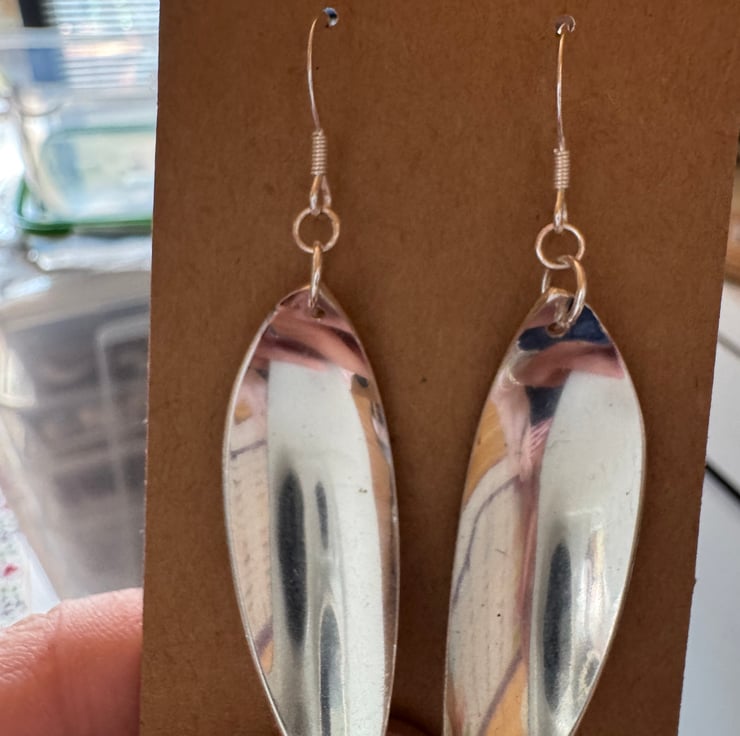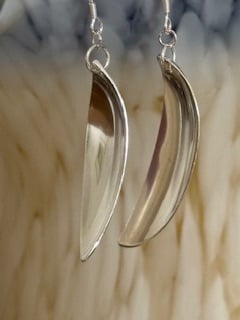These unique earrings are handcrafted from vintage sterling silver cutlery, loving transformed into wearable art. This pair is made using vintage treasures giving them a new life whilst preserving the beauty of their past. They have a 5cm drop and a mirror finish (hence the reflection!) and are perfect for both everyday wear and special occasions.