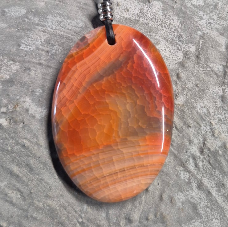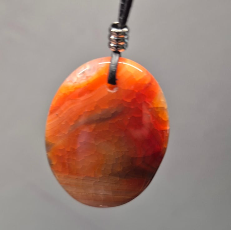 Red Dragon Vein agate oval pendant on black leather cord with stainless steel connector and slider.