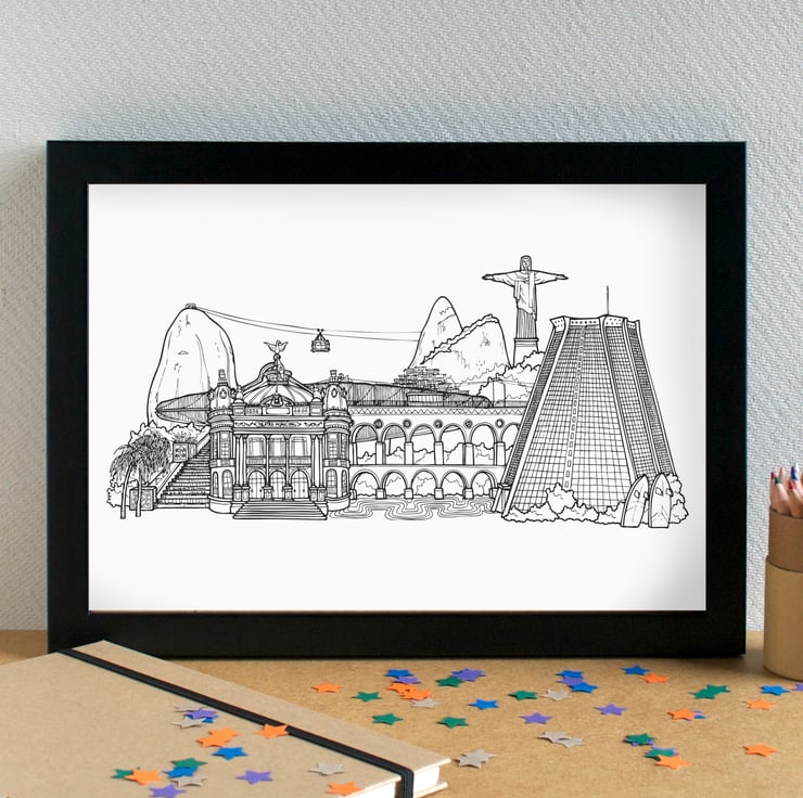 A stunning, detailed print of my hand drawn skyline illustration of the most famous landmarks in Rio de Janiero, Brazil.