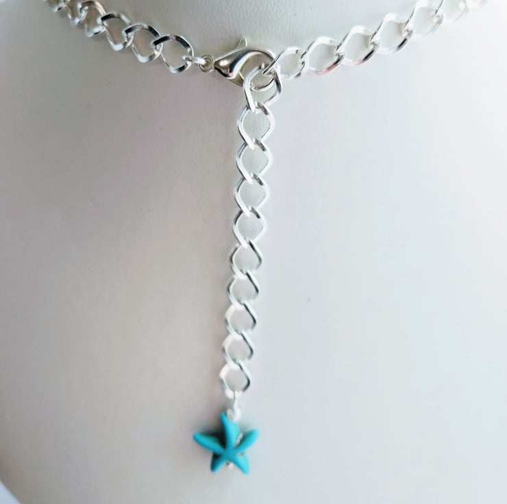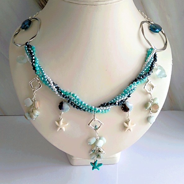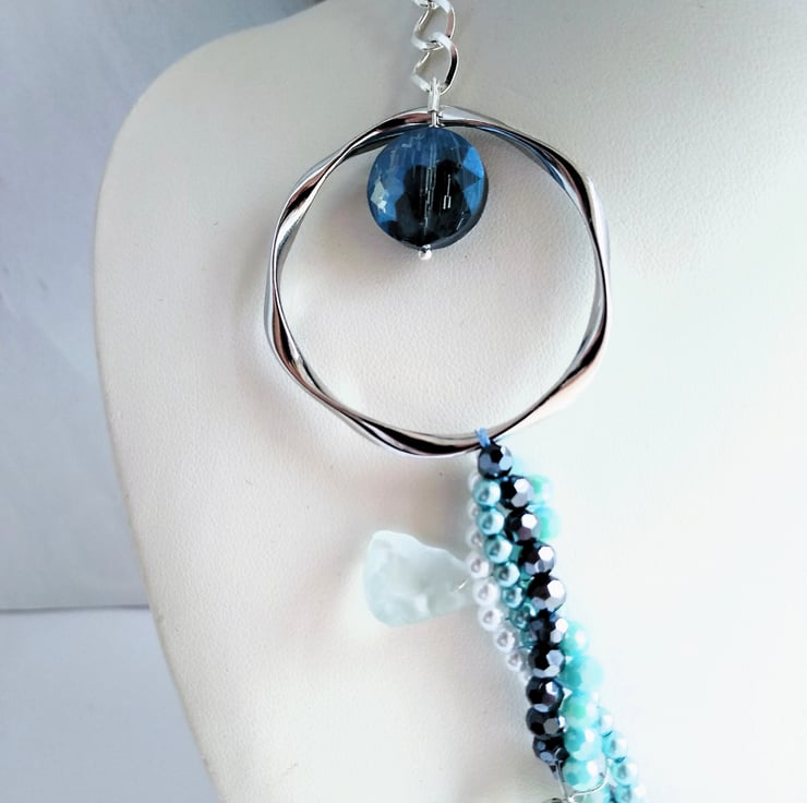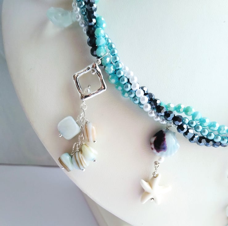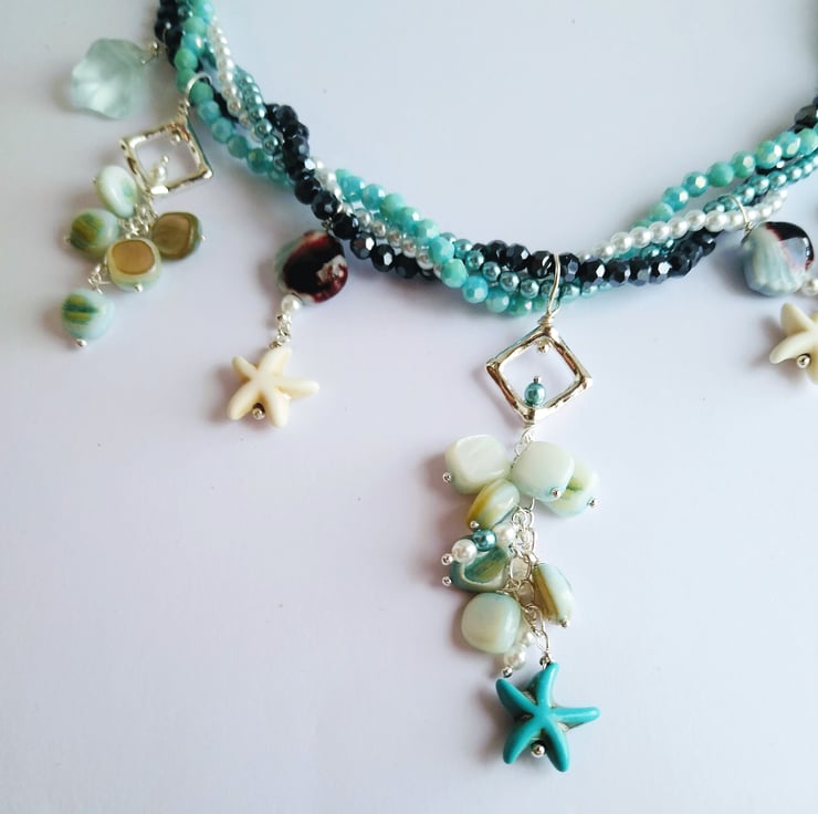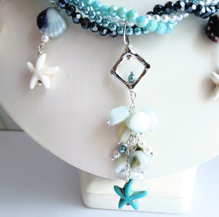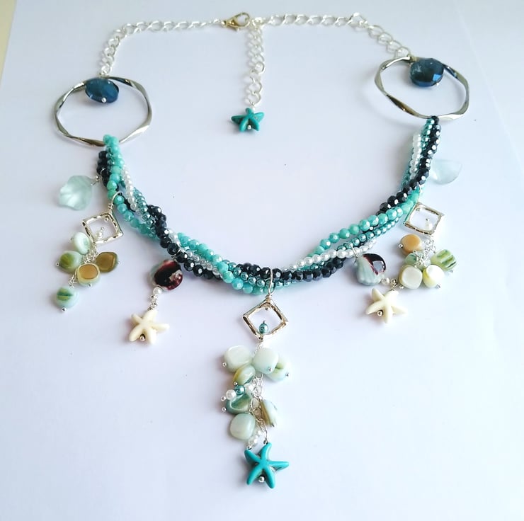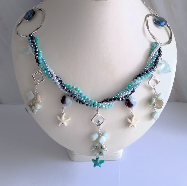 A magical necklace to capture the essence of the sea and tales of mermaids and lost treasures. This stunning necklace offers you the all the shades of blue in the four strands of twisted crystal and pearlescent bead chain. With droplets of smooth natural aquamarine sea glass, shiny ceramic shell shaped beads, clusters of blue coloured real shell alongside the starfish shaped beads. All cascading from two large silver plated rings and large linked adjustable curb chain, length 18 - 20 inches (46 - 51 cm).