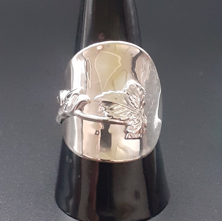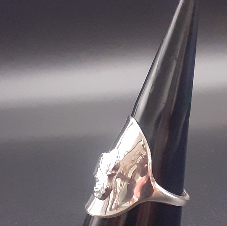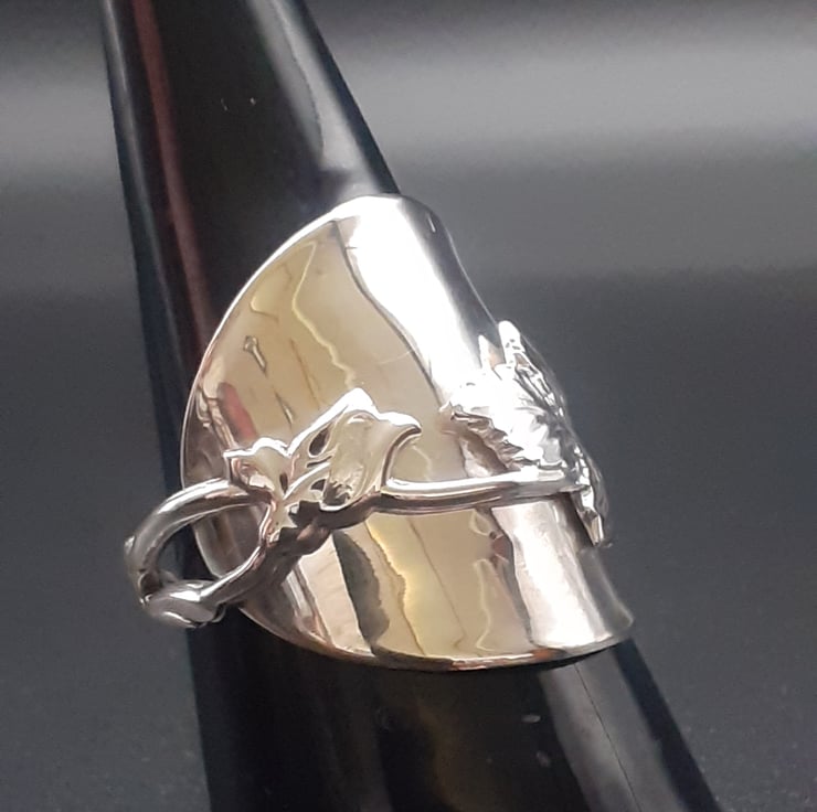 This is a pretty little ring, the craftsmanship is fantastic, I fashioned the spoon into this ring myself, size uk 'R'.
