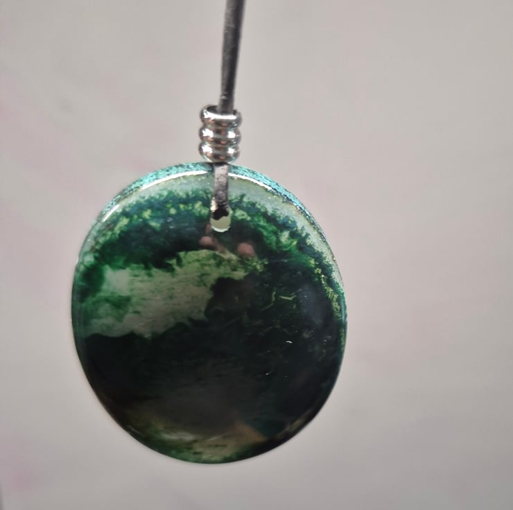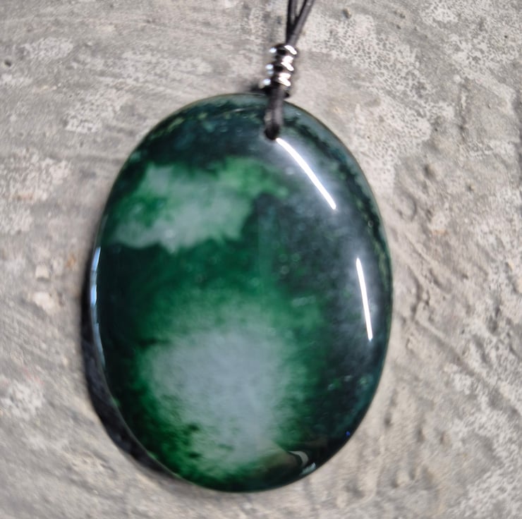 Green onyx oval pendant on black leather cord with stainless steel connector and slider.