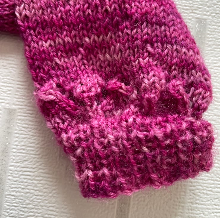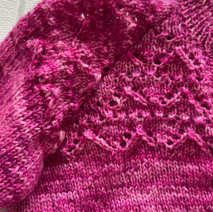 The yarn used is 100% Bluefaced Leicester wool and is hand dyed in a variegated pink and should be hand washed.