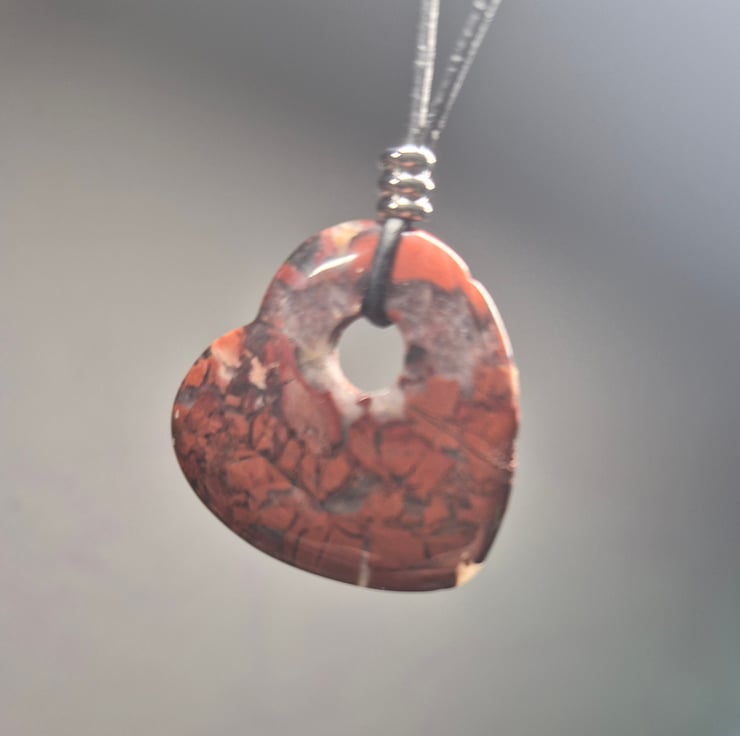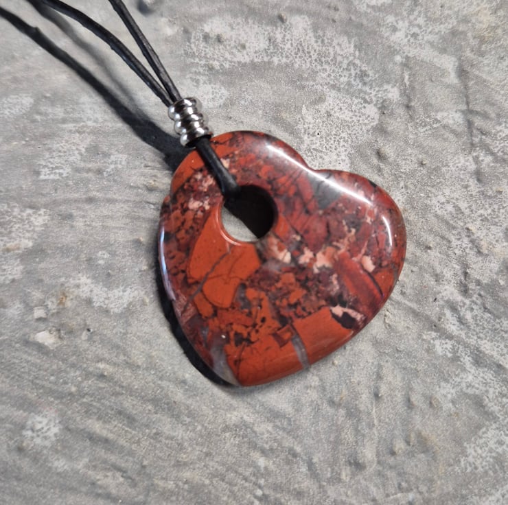 Red jasper heart pendant on black leather cord with stainless steel connector and slider.