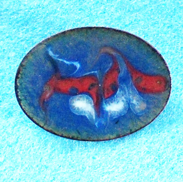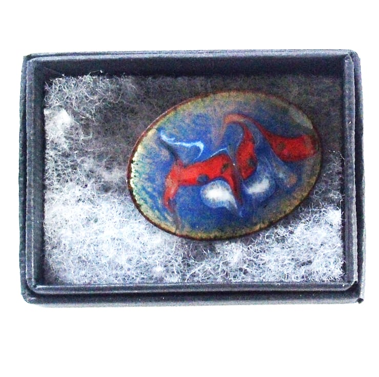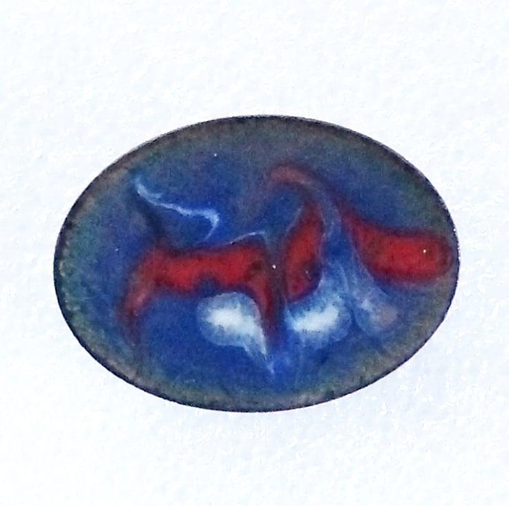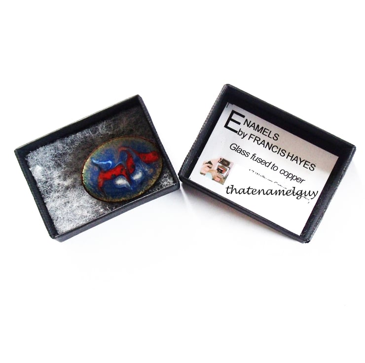 After building a base of sevral layers of clear enamel on the copper oval shape I have added a single layer of blue. After firing that I have added a scattering of red enamel and another of white enamel. I have then, when the piece was at red hot, in the kiln, drawn a steel point through the surface to draw out the red and white pattern you see. The copper base shines through the layers of decoration in tones of gold and brown.