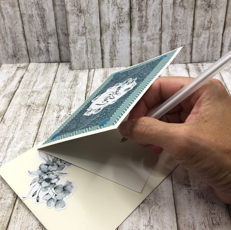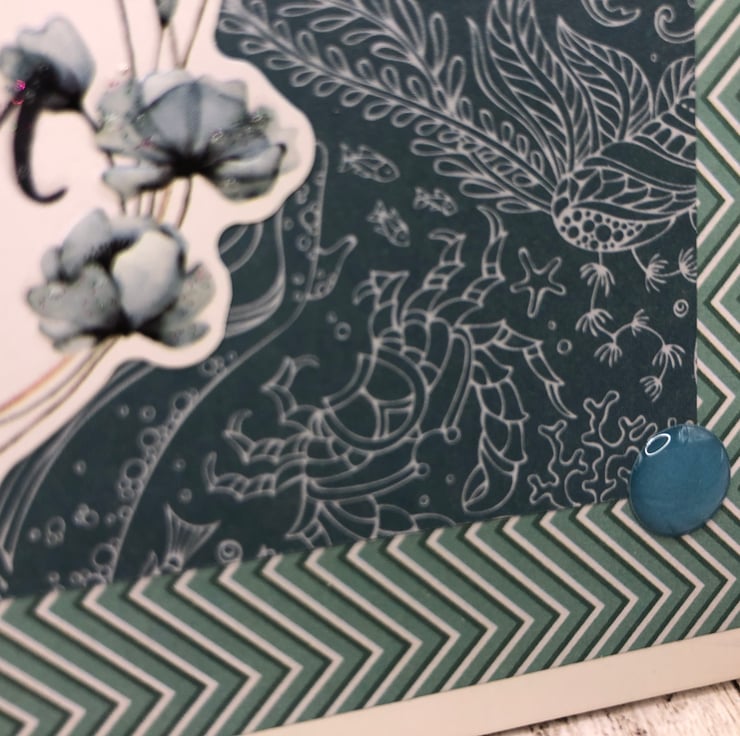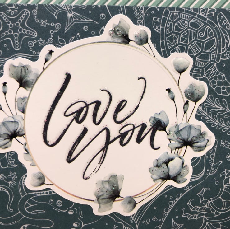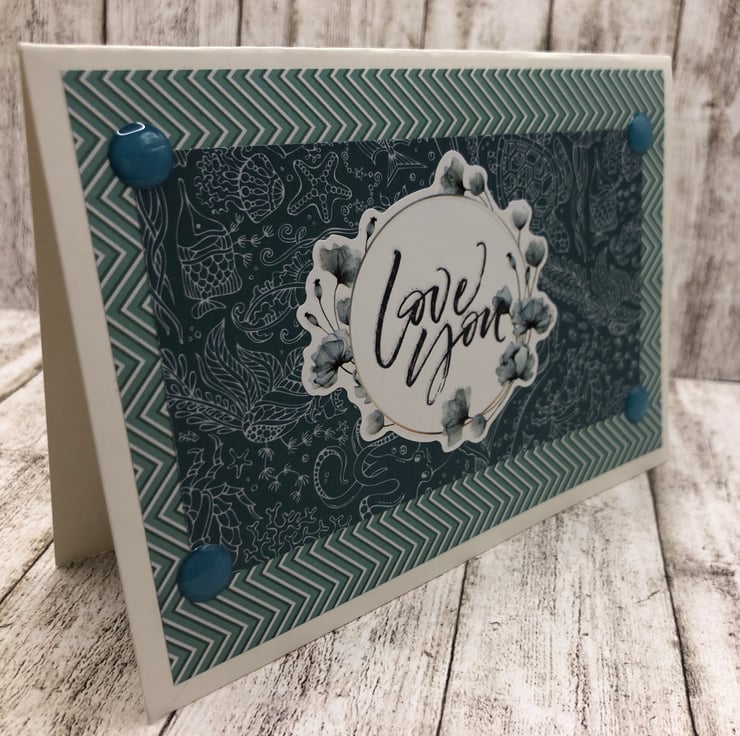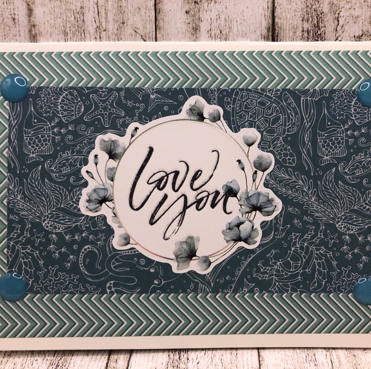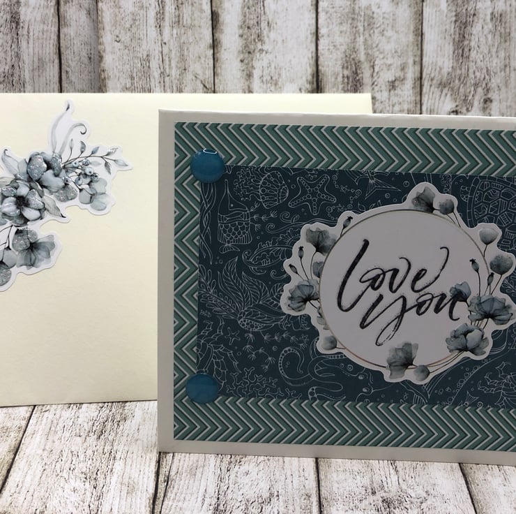 The central panel has the sentiment "Love You" embossed with glitter and floral elements in a circle. The teal colours are picked up in a nautical themed paper with fish, octopus, plants in white. A chevron style paper frames the design, and the base card is cream with matching envelope decorated with similar flowers. Inside is blank. Perfect for Valentines, wedding anniversary, friends, girlfriend, daughter, mother's day. Size 10.5cm by 14.5cm