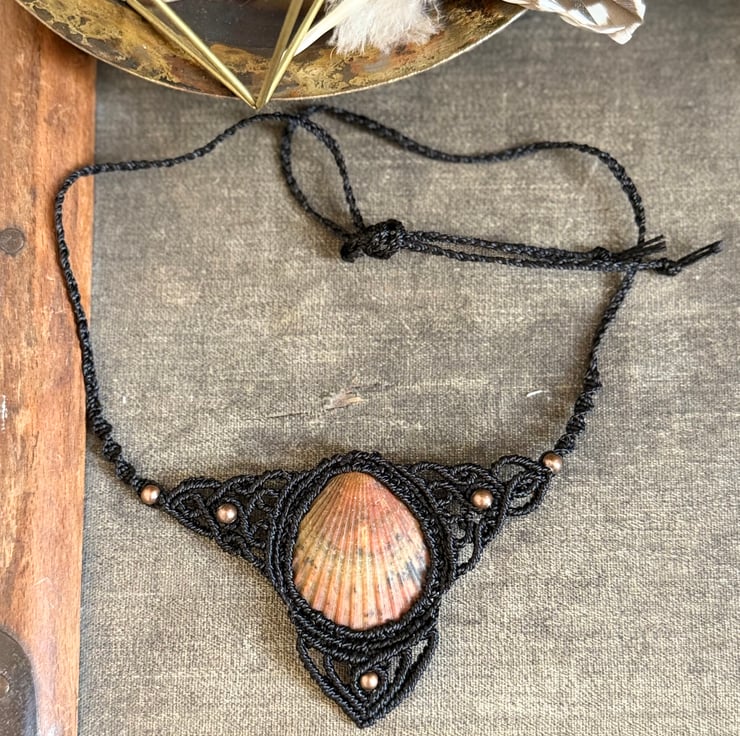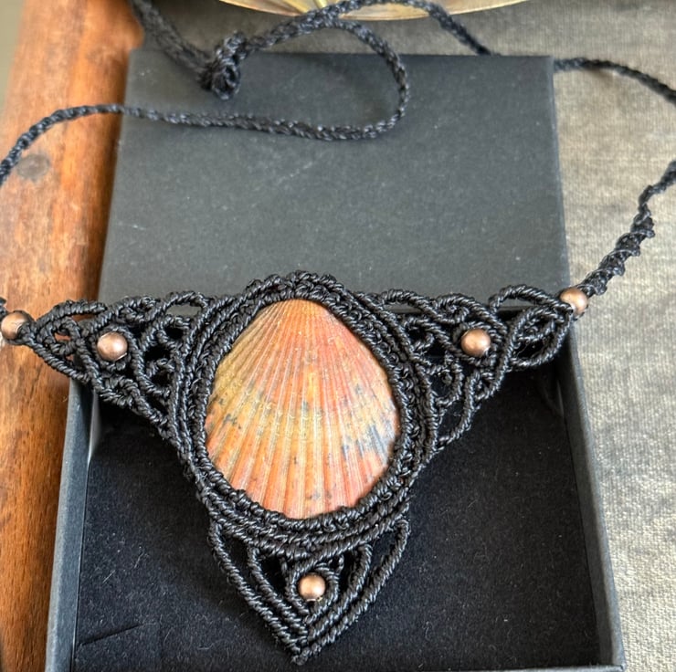 A lovely necklace using a unique rust coloured seashell, and complementing beads.