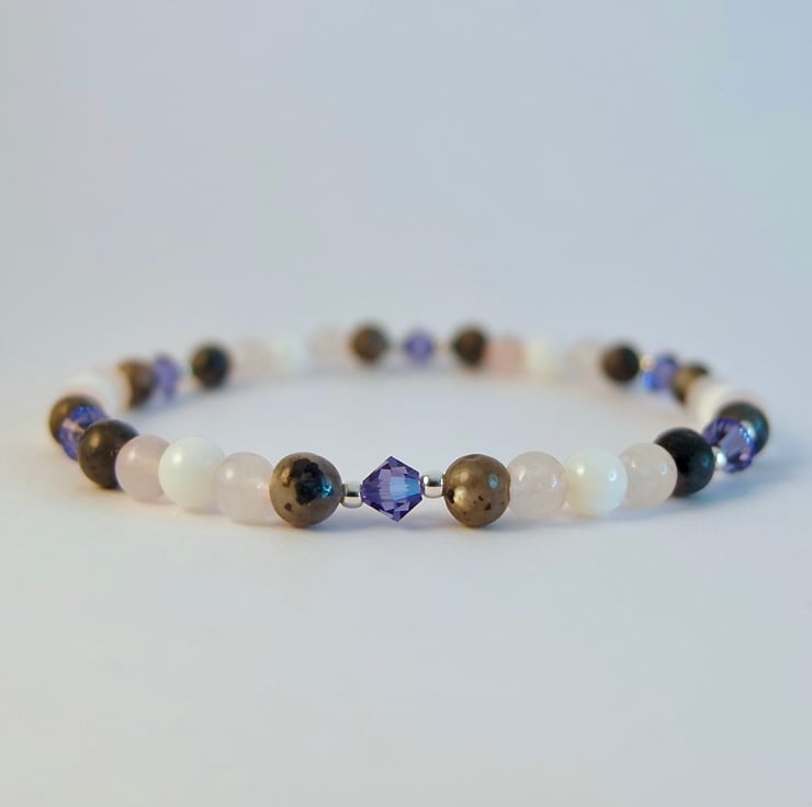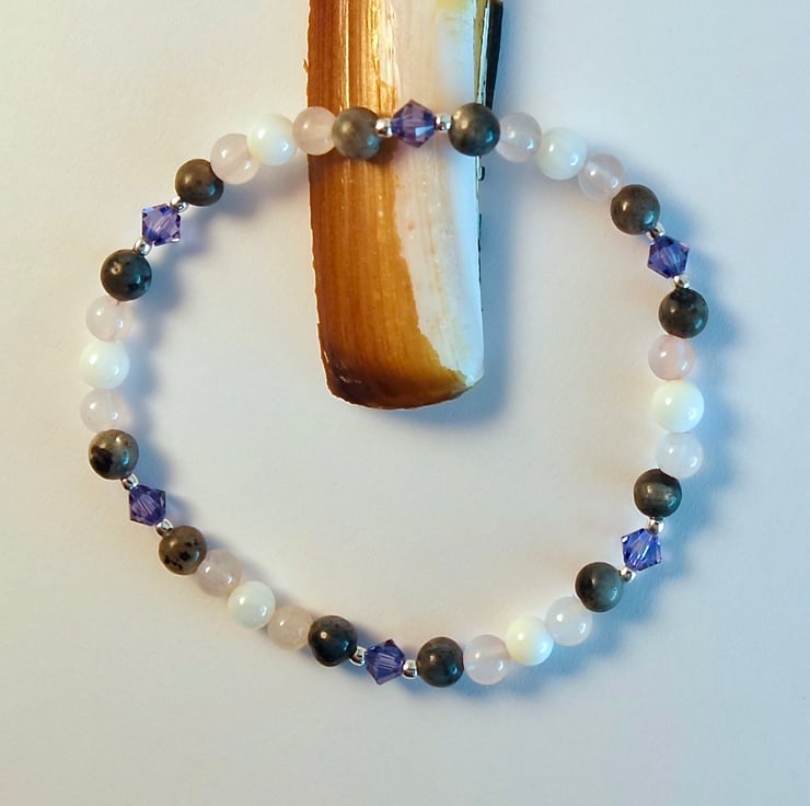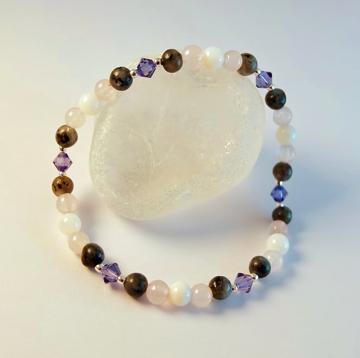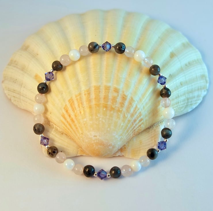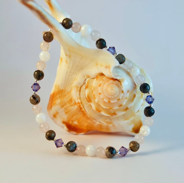 Quality Austrian crystals, in a colour called 'tanzanite' are highlighted with tiny sterling silver spacers and set between 4mm mixed gemstone beads of Rose Quartz, Labradorite, and white Shell.