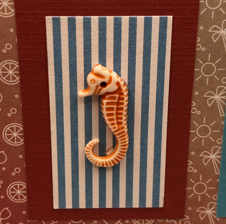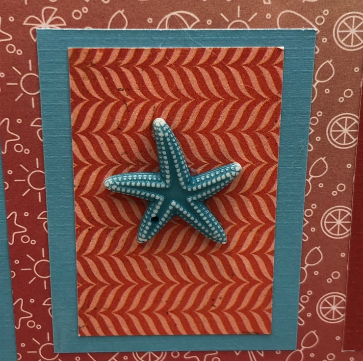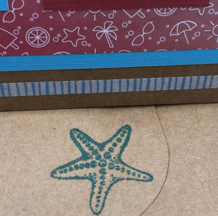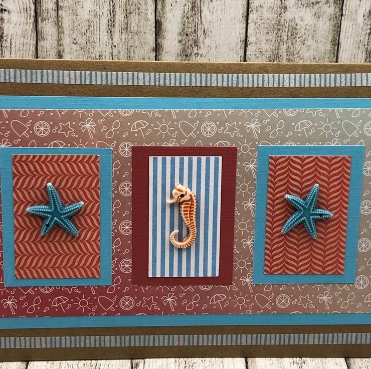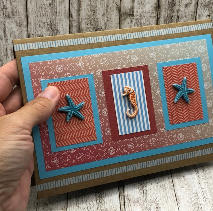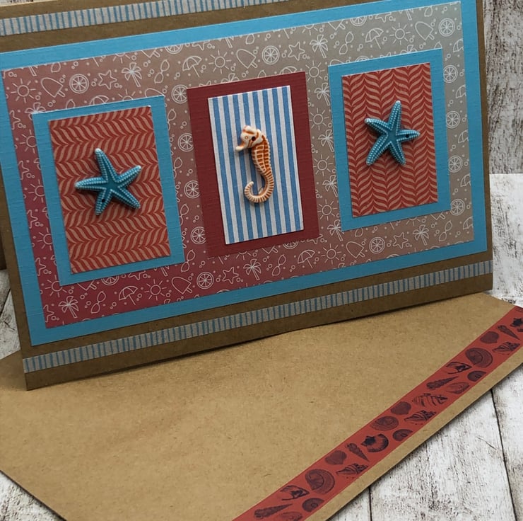This bright summery card uses blue and peach as contrasting colours, a striped washi tape runs across the top and bottom. A summer themed paper with palm trees, sunglasses, and other beach day essential forms the background. On top of this I've layered three rectangles showcasing the nautical embellishments, two starfish and a seahorse . The main card is brown with an envelope that has a starfish stamped on the back. Inside is blank. Size 12.5cm by 17.5cm. Perfect for many occasions from Birthday, thank you, congratulations, good luck, well done. Who doesn't love a beach themed nautical card !