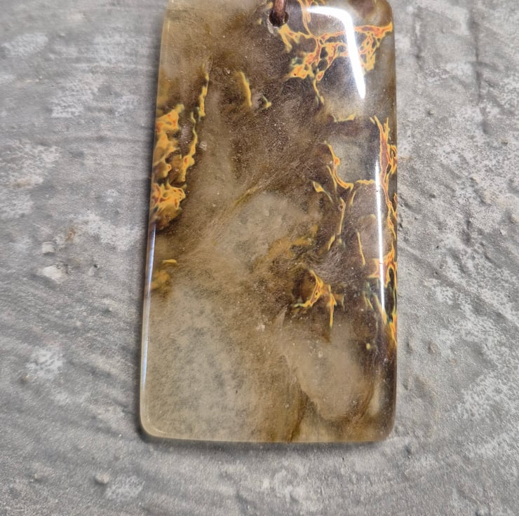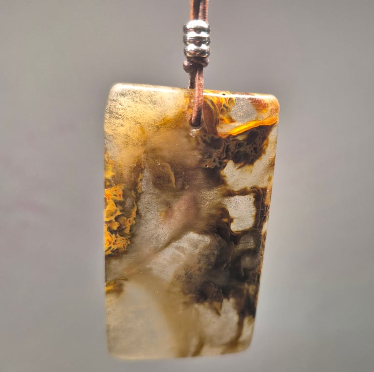 Plume Agate rectangle pendant on gypsy sippa leather cord with stainless steel connectors and sliders.