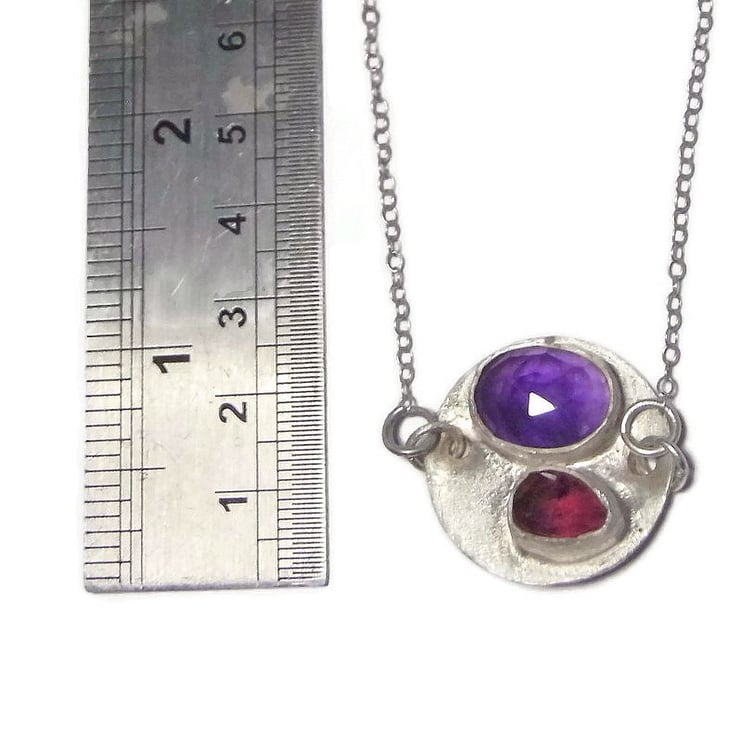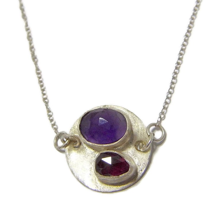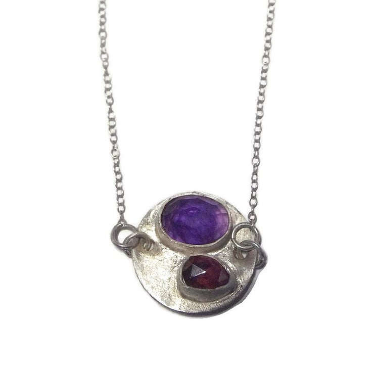 Handmade Sterling Silver Disc Necklace, Amethyst & Garnet Gemstone Pendant