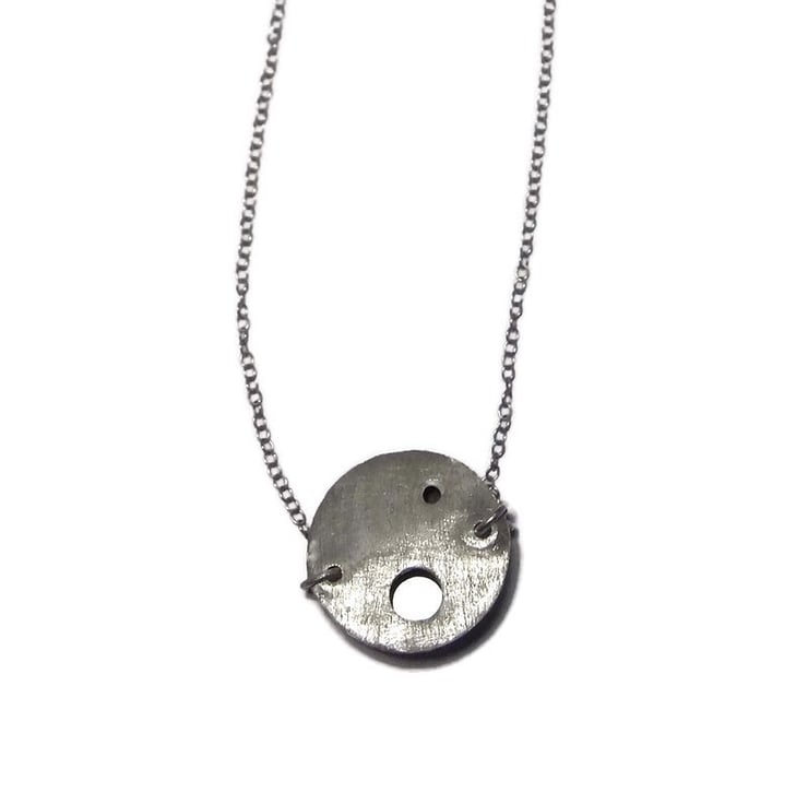 The silver disc measures 25mm in diameter and hangs from two 25cm long sterling silver chains which fasten with a bolt clasp