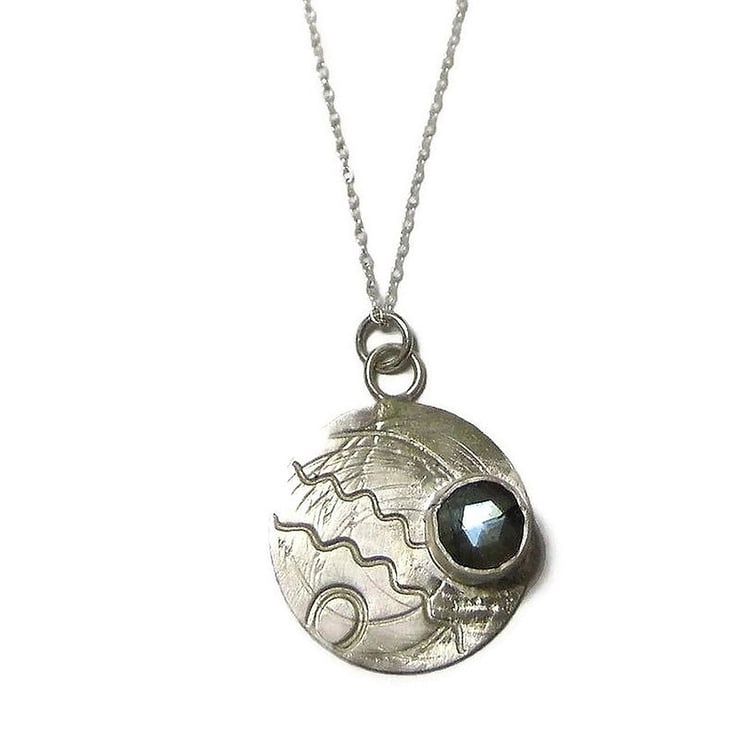 Handmade Roller Printed Sterling Silver Disc Pendant with Rose Cut Labradorite
