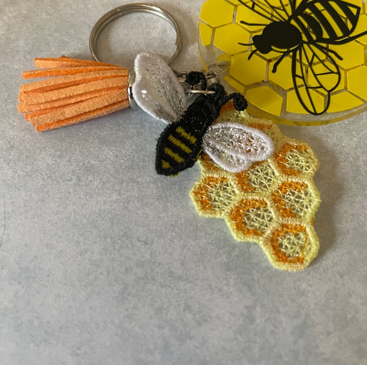 Keychain with free standing lace honeycomb and bee, leather tie on plastic disc and vinyl honeycomb and Bee you lettering. All handmade and assembled.