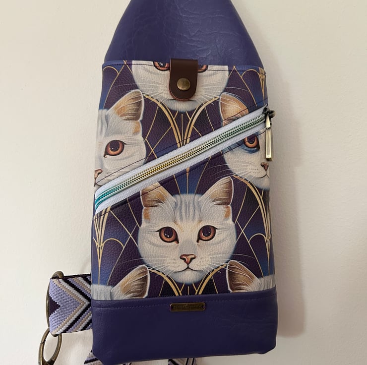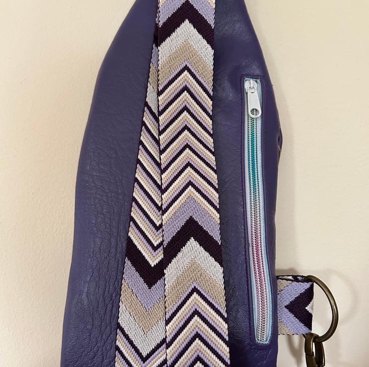 This is a crossbody sling bag. It can be worn over clothing or under a coat. It measures 30 cm long and 15cm wide and has three pockets which can fit phone, keys, cards and money. The back pocket is ideal for a passport.