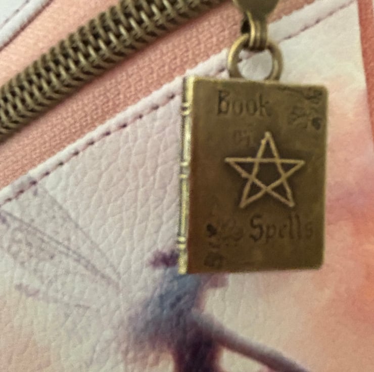The bag is made from a lovely vinyl panel depicting a dragon and a fairy. It has a cute zip pull in the shape of a spell book. The main body is made from mora faux leather with a cotton lining.