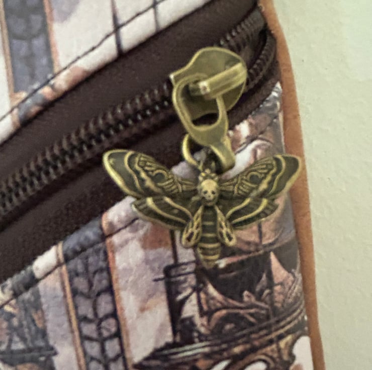 The bag is made from vinyl in a raven/skull pattern , brown mora faux leather with a cotton lining. The zip depicts a death’s head hawk moth.
