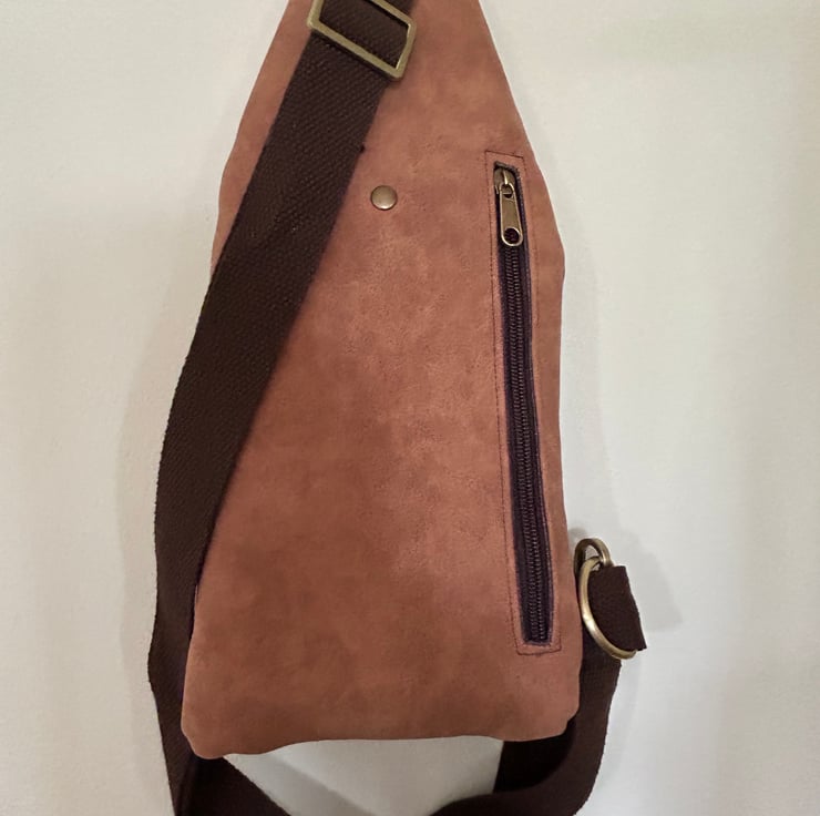 This is a crossbody sling bag. It can be worn over clothing or under a coat. It measures 30 cm long and 15cm wide and has three pockets which can fit phone, keys, cards and money. The back pocket is ideal for a passport.