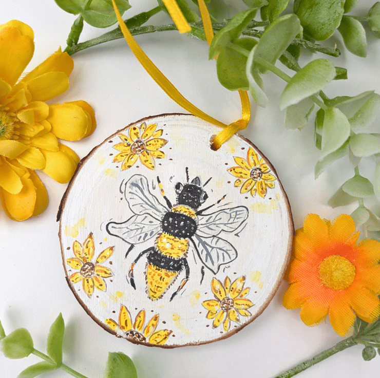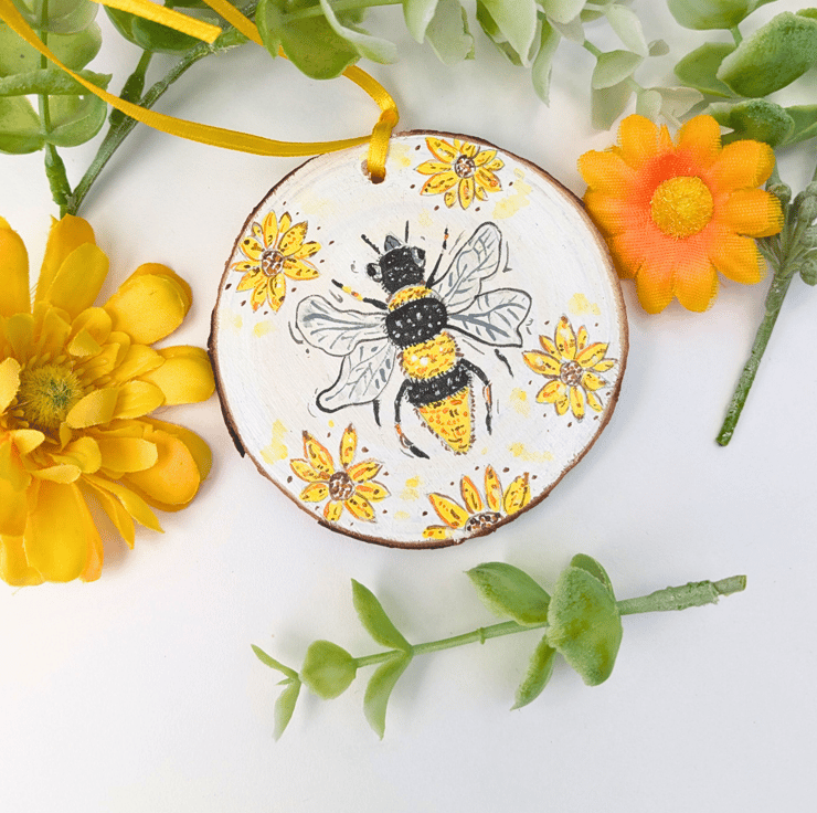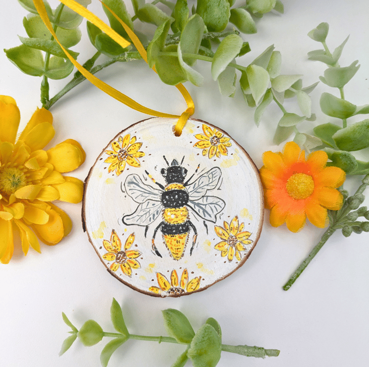 A beautiful hand-painted Bee log slice decoration. Lovingly painted in acrylics and sealed with a gloss varnish. The perfect gift for any bee lover.