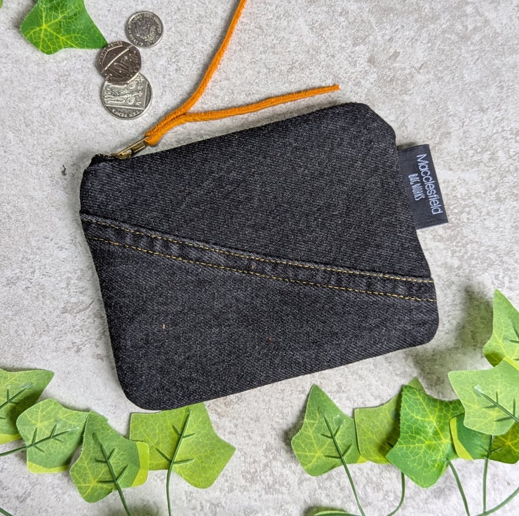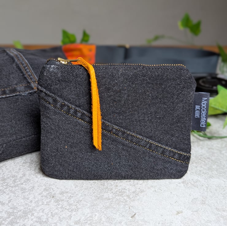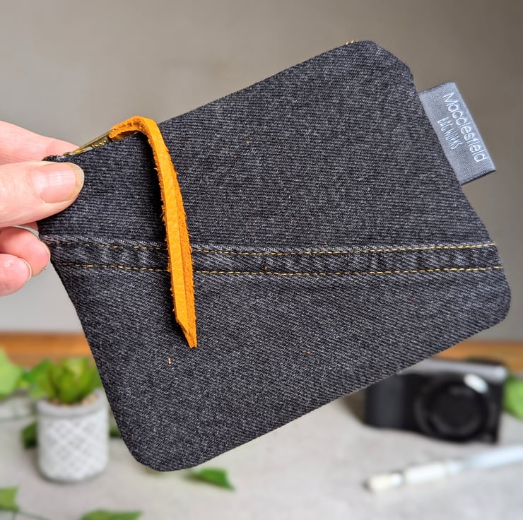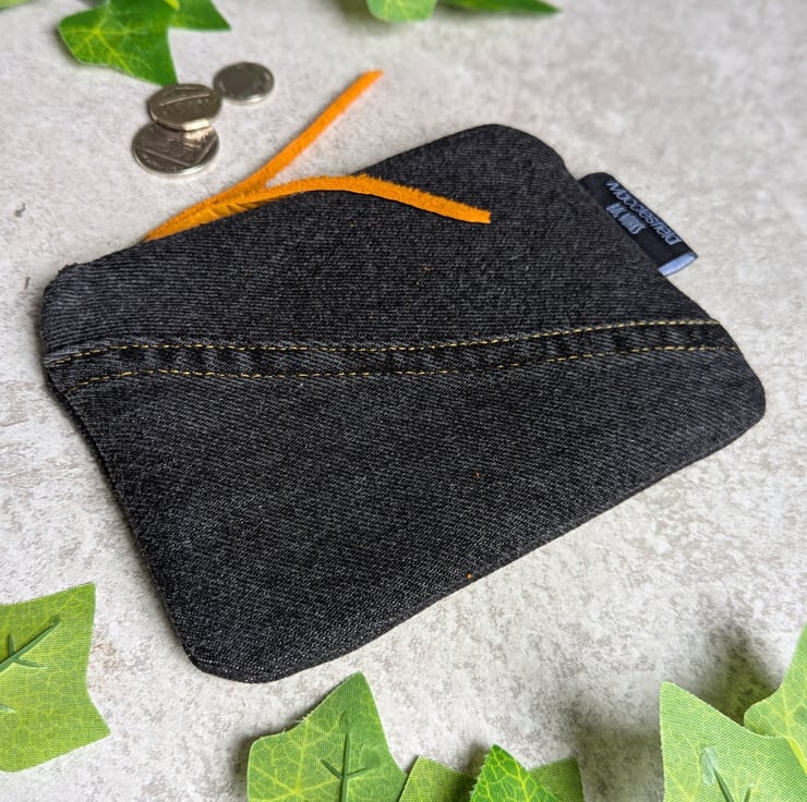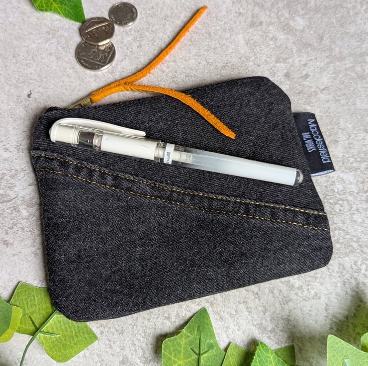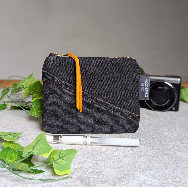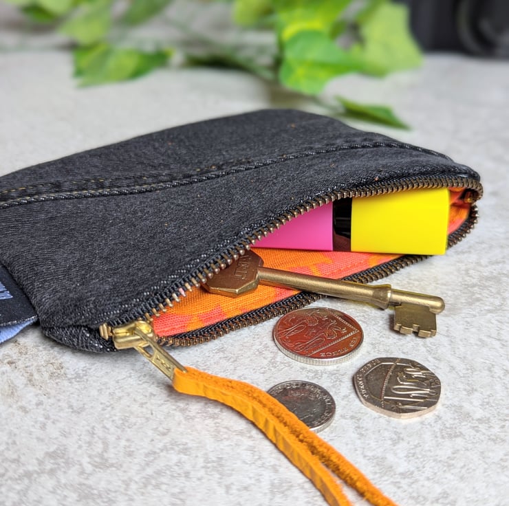 It has a reclaimed jeans zip with orange reclaimed leather zip pull been added. Pop inside of your bag, it's ideal for use as a make-up bag, small pencil case or purse. Or great for all those little bits that end up in the bottom of your bag - tissues, lip balm, earbuds etc.